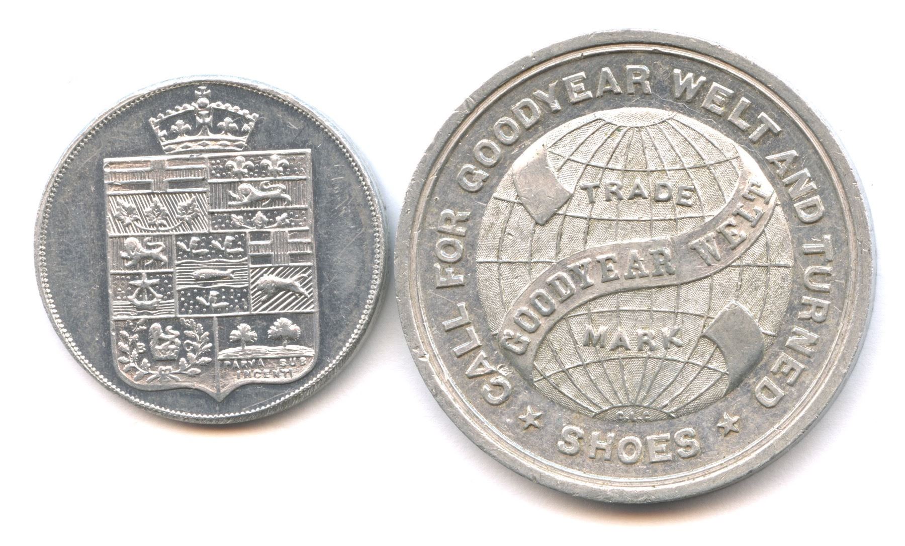 Lot of two (2) tokens. 1.) Lr. 995c. 24.9mm. 2.63g. Plain edge. Unsigned. Brilliant and prooflike. Unc. 2.) Lr. 995x. 38.0mm. 6.53g. Plain edge. Signed C.L.C. Muted silver-grey with two small digs right of the hand. XF.