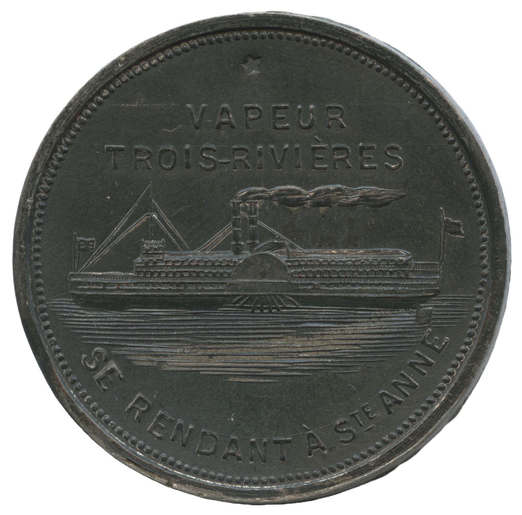 Unlisted in any of the standard references. 33.4mm. 10.3g. Plain edge. Signed C. TISON. Obverse is that of Lr. 1517a, Breton-169, while the reverse is similar the obverse used on Lr. 1701a, Charlton-6065. However, the details on the side-wheel steamer are incomplete, no scrollwork is present in the upper obverse field, and it its place is a pentagonal star punched into the planchet. Scribe lines appear through the legends. Warren Baker offered a medal from the same die pair in his Token & Medal List No. 12 (10/1969), but no mention was made of a star punch or other details. This may be a test strike before the dies were completed. It is the only one we are aware of and may represent a unique opportunity for advanced specialists. Bid accordingly.