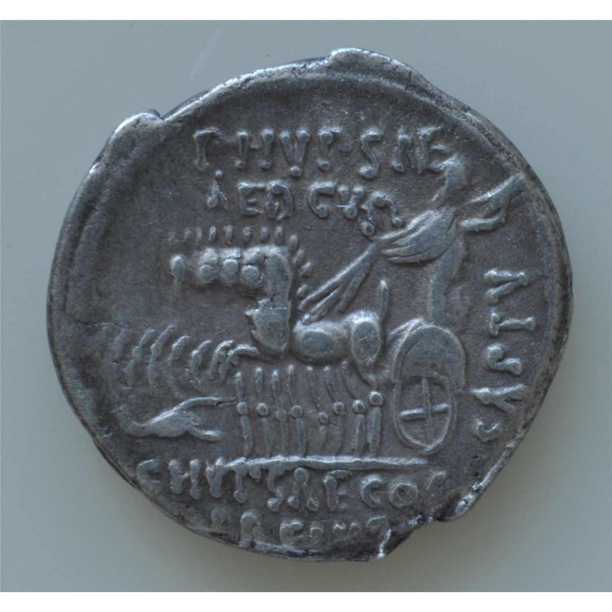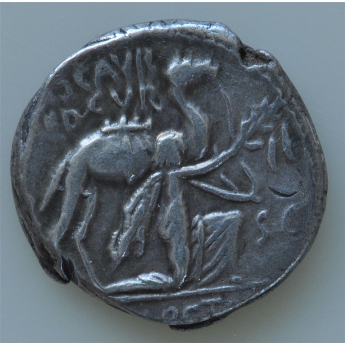 M.Aemilius Scaurus (58 BC) - AR-Denarius Obv: King Aretas of Nabataea kneeling in supplication, beside camel, giving an olive branch. M SCAVR / AED CVR above, S C in r. field. Rev: Jupitur in quadriga l., scorpion below horses. PHVPSAE/ AED CVR above horses, CAPTV in r. field and in ex. C HVPAE COS/PREIVER. A very busy little coin. 3.8 grams, S-379 Var., Craw 422, AVF.