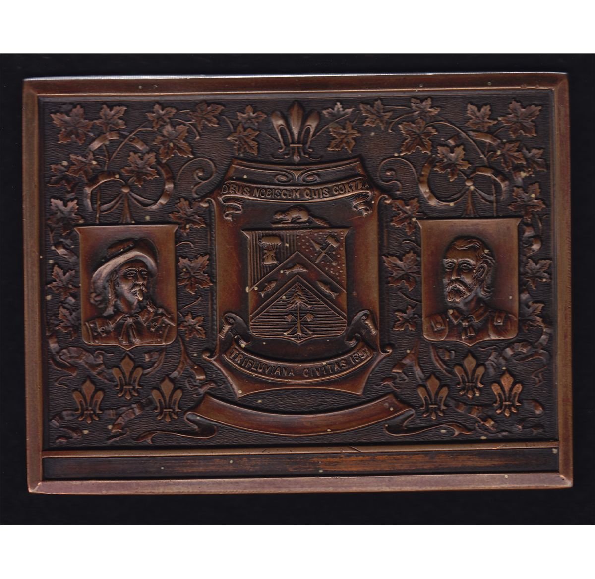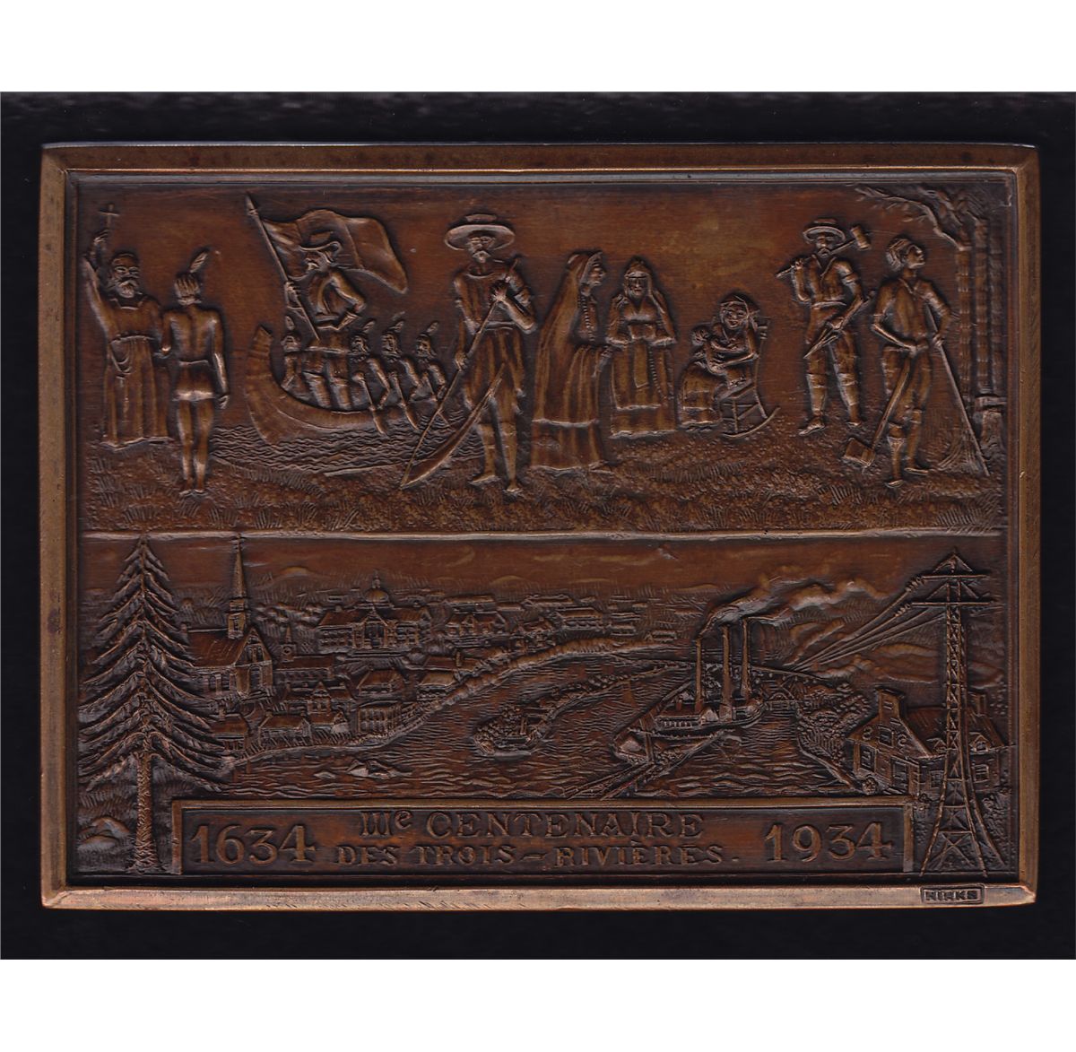 Magnificent Bronze plaque commemorating the 300th anniversary of Trois Riviere - (Three Rivers) produced by Birks. Obv. Pictorial representation of original settlers combined with the 1934 version of the city. Rev. Busts of Champlain and a second male (crest). 185X65, UNC.