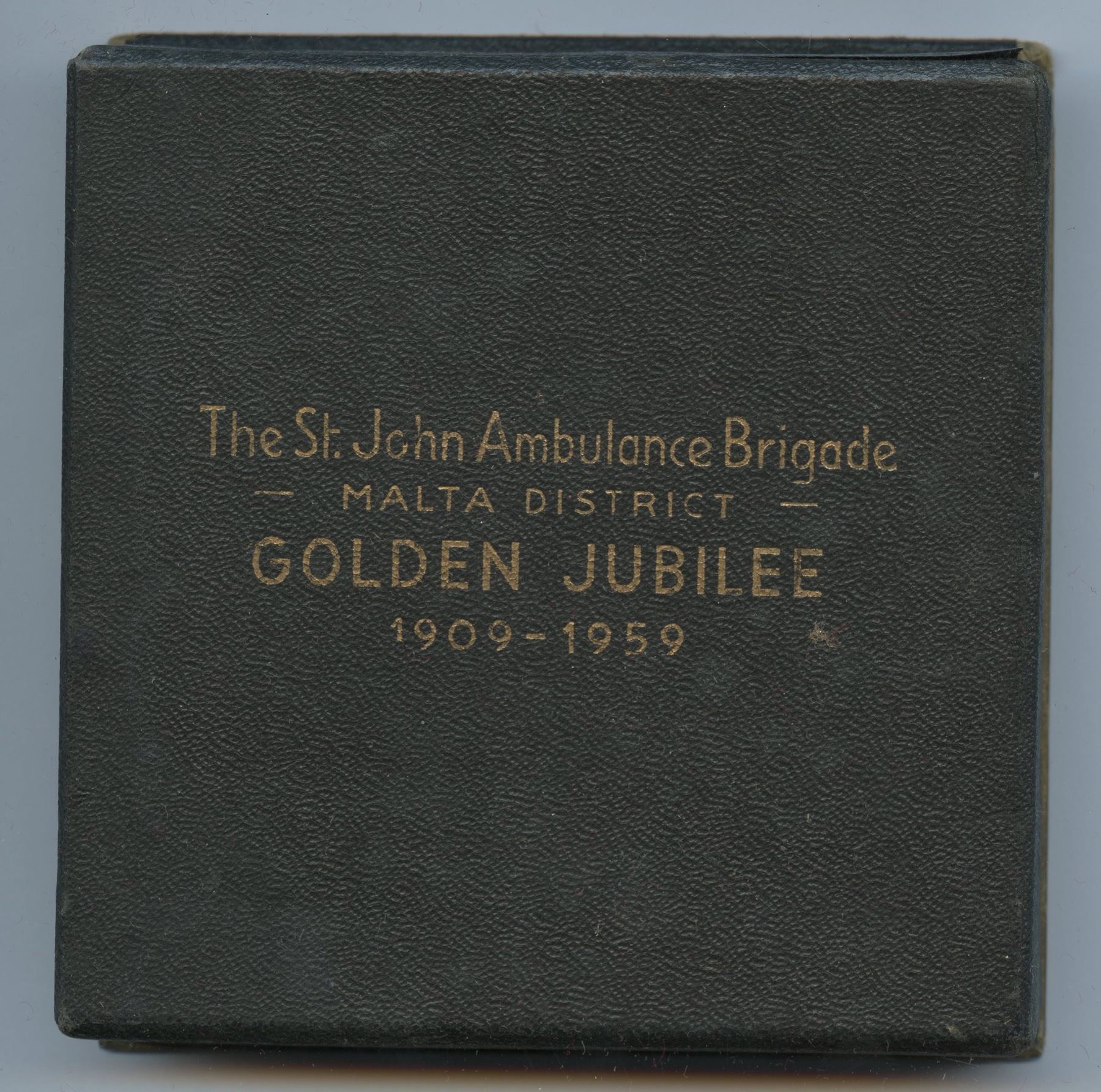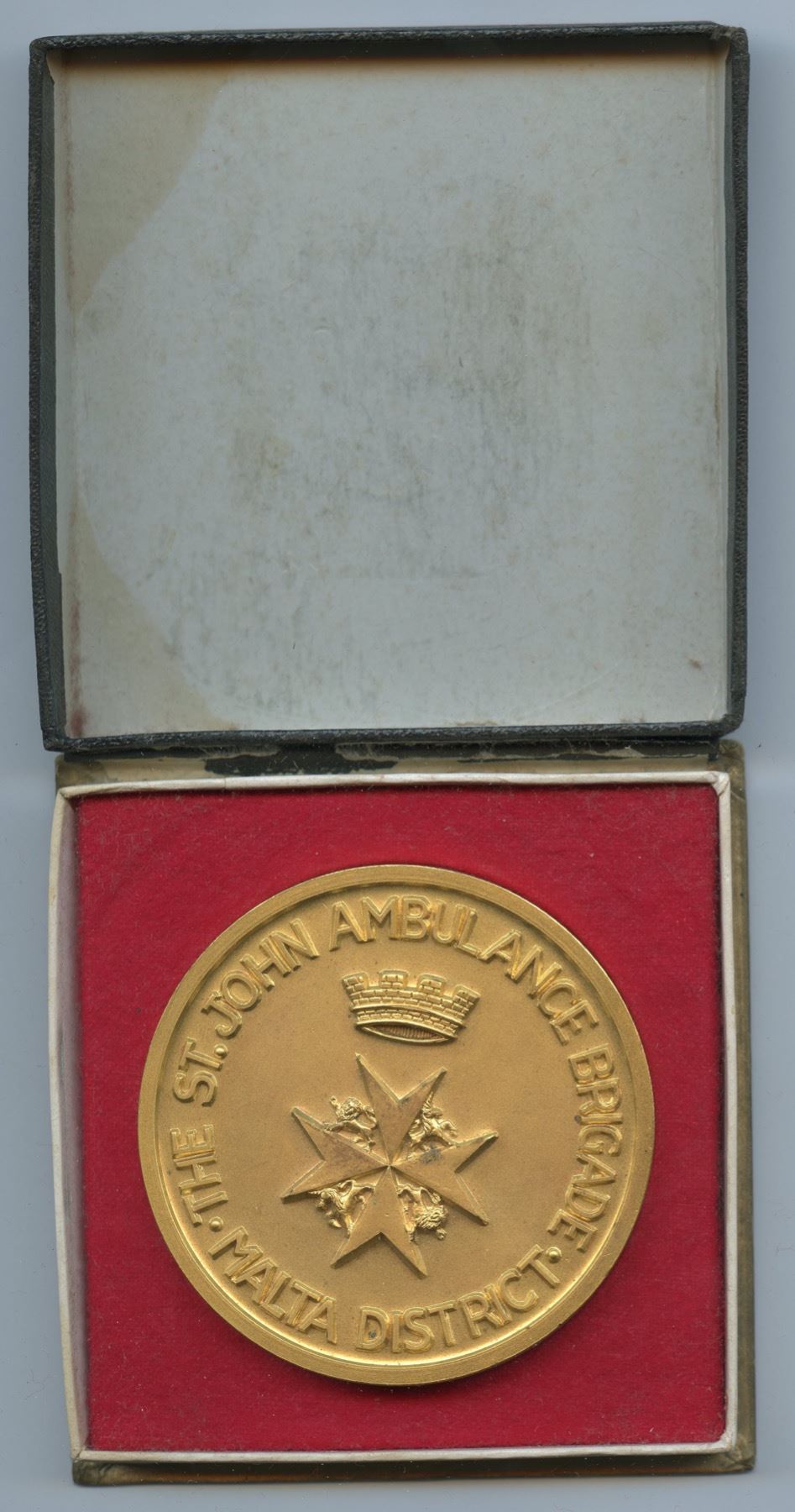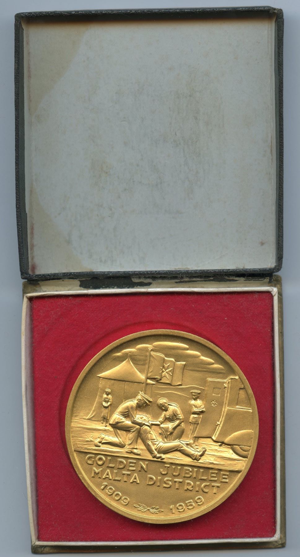 St John Ambulance Medals from Malta. 1909-1959. Obverse: ST. JOHN AMBULANCE BRIGADE. MALTA DISTRICT. Reverse: GOLDEN JUBILEE / MALTA DISTRICT / 1909 – 1959. Diameter 70 mm, Weight 162 grams, struck in gilt and in original named box with plush interior & 1906-1959 in presentation box.