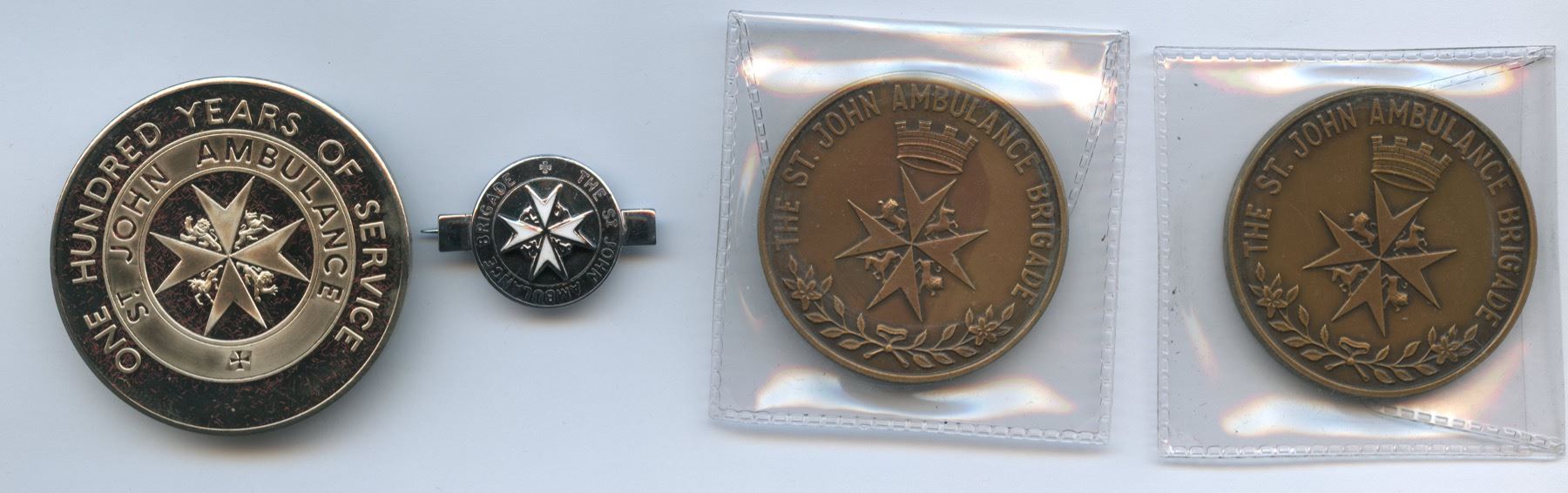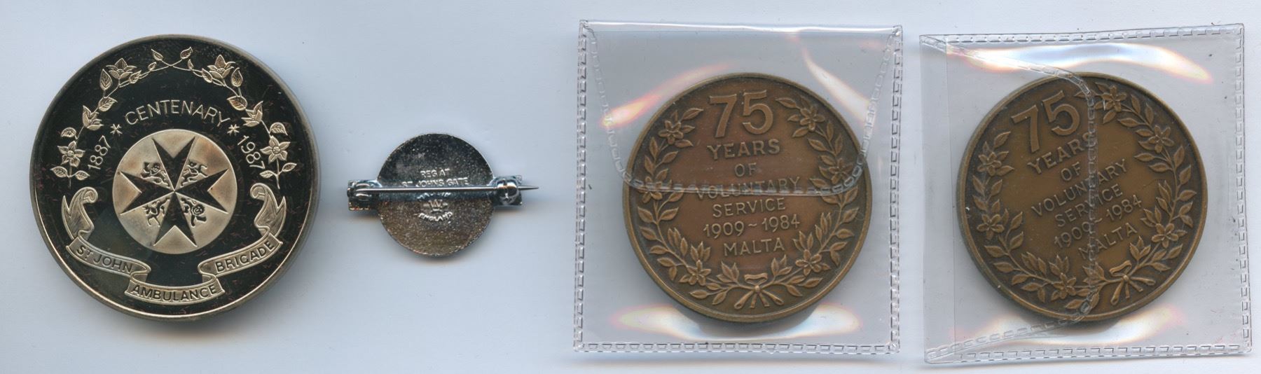 St John Ambulance Brigade Centenary 1867-1967 Limited Edition Solid Nickel Silver medal in case of issue. Two 75 Years of Voluntary Service 1909-1984 Malts, and a and St John pin. (4)