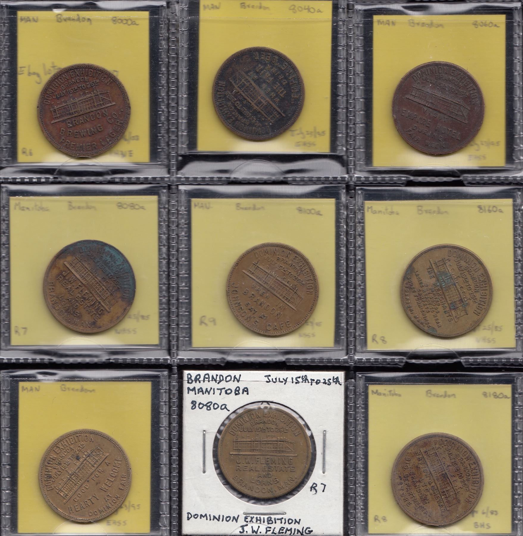 as well, but do not express a value and are considered advertising commemoratives, and as such are listed by Stewart only. Brandon, Brandon Brewing Co. 8000a; “Empire” beer 8040a; Empire Hotel 8060a; J.W. Fleming Real Estate 8080a (2); Johnson’s Café 8100a; The Merchants Ltd. 8160a (staining); Nation & Shewan Ltd. 8180a; Good For a Hearty Welcome, unlisted. Fine-EF. 9 Pcs.