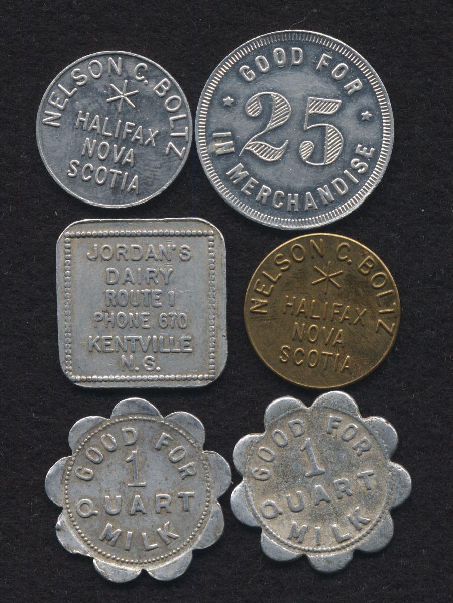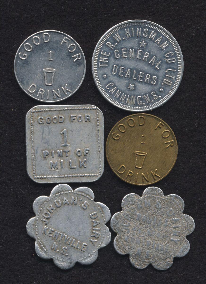 Jordan's Dairy of Kentville, NS, ( 3 different), Nelso Boltz, Halifax, NS, 2 different drink tokens, R.W. Kinsmenn Co., of Canning, NS (6 pcs)