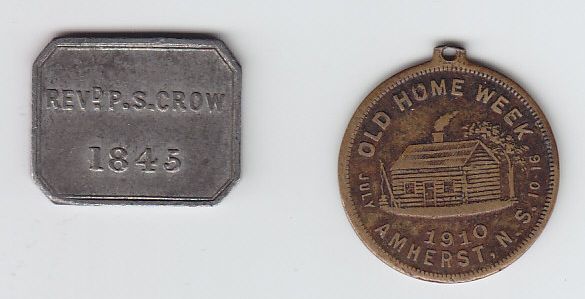 Lot of two: Communion token Nova Scotia, Noel, BO NS-270; Amherst, NS Old Home Week, 1910, brass, (cabin), rev crest. 2 Pcs.
