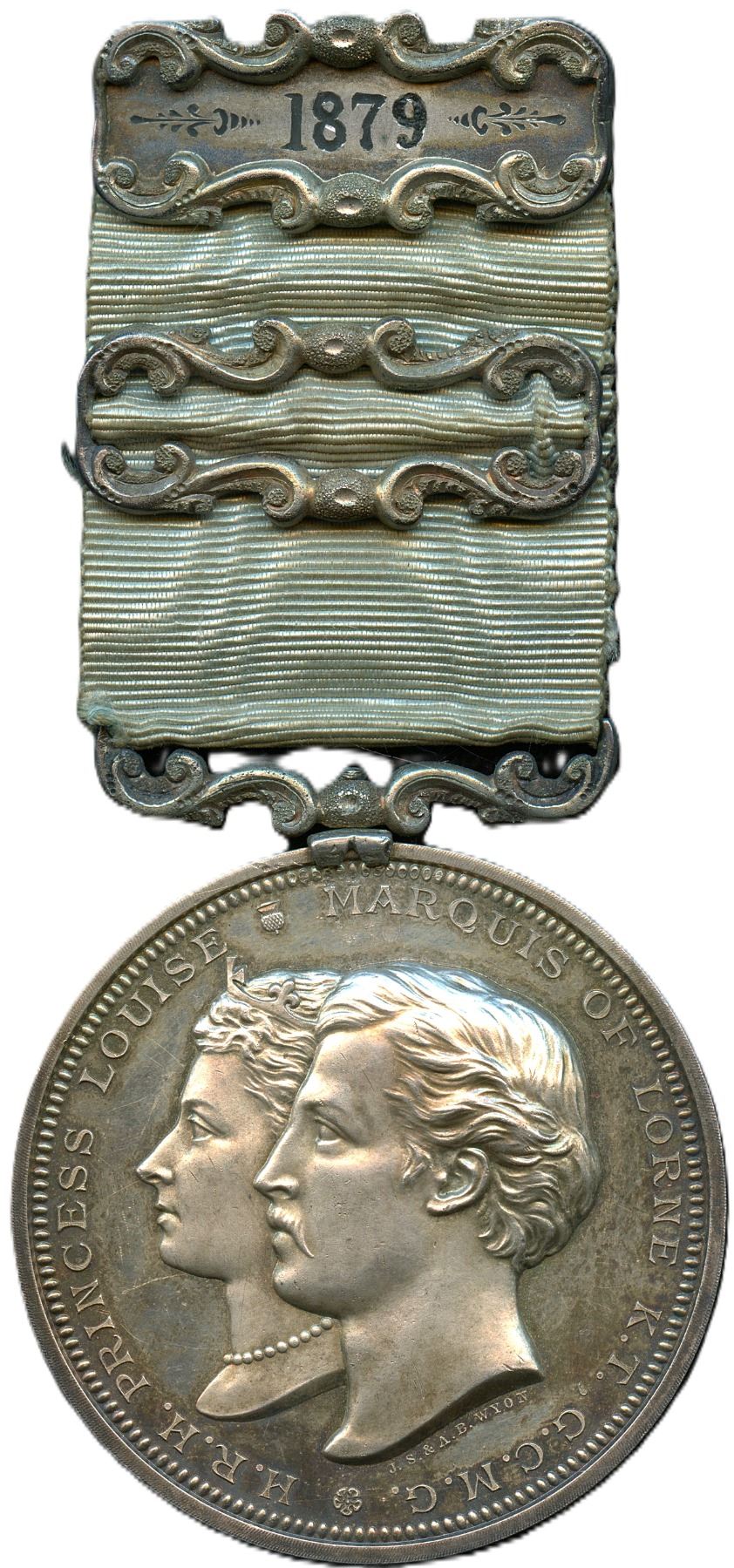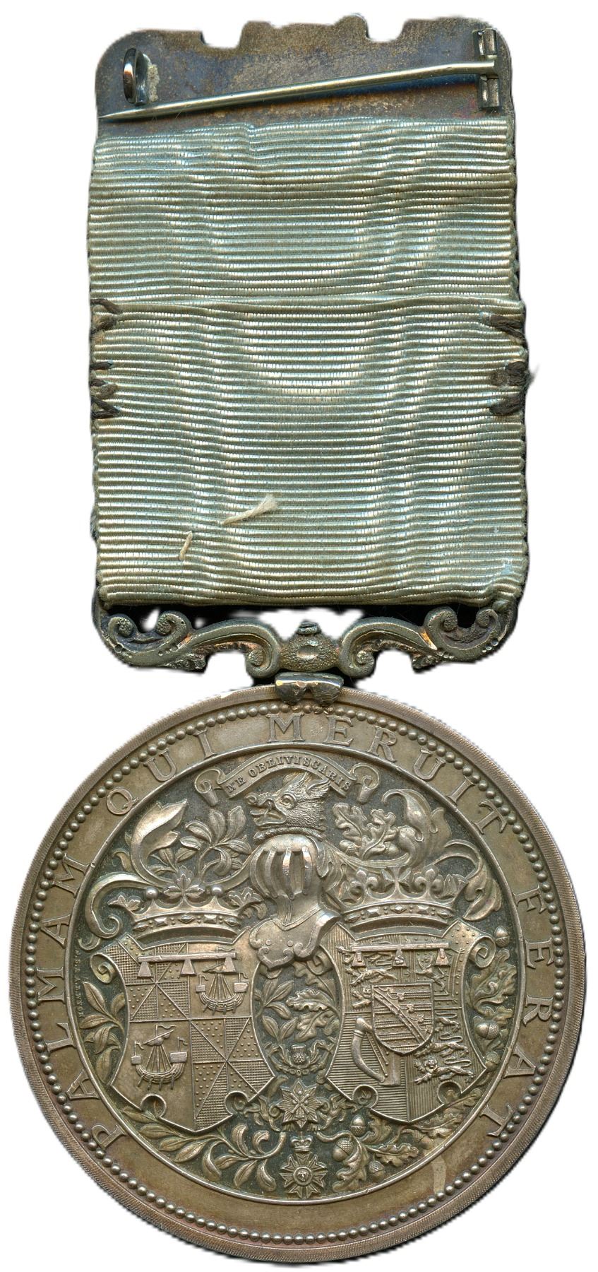 As above, featuring the original and distinctive hanger, dating the piece to 1879. The silver surfaces are beautifully toned in a natural golden hue surrounding the devices. Appears unworn, with only a few minor contact marks. From the Geoffrey Bell Collection.