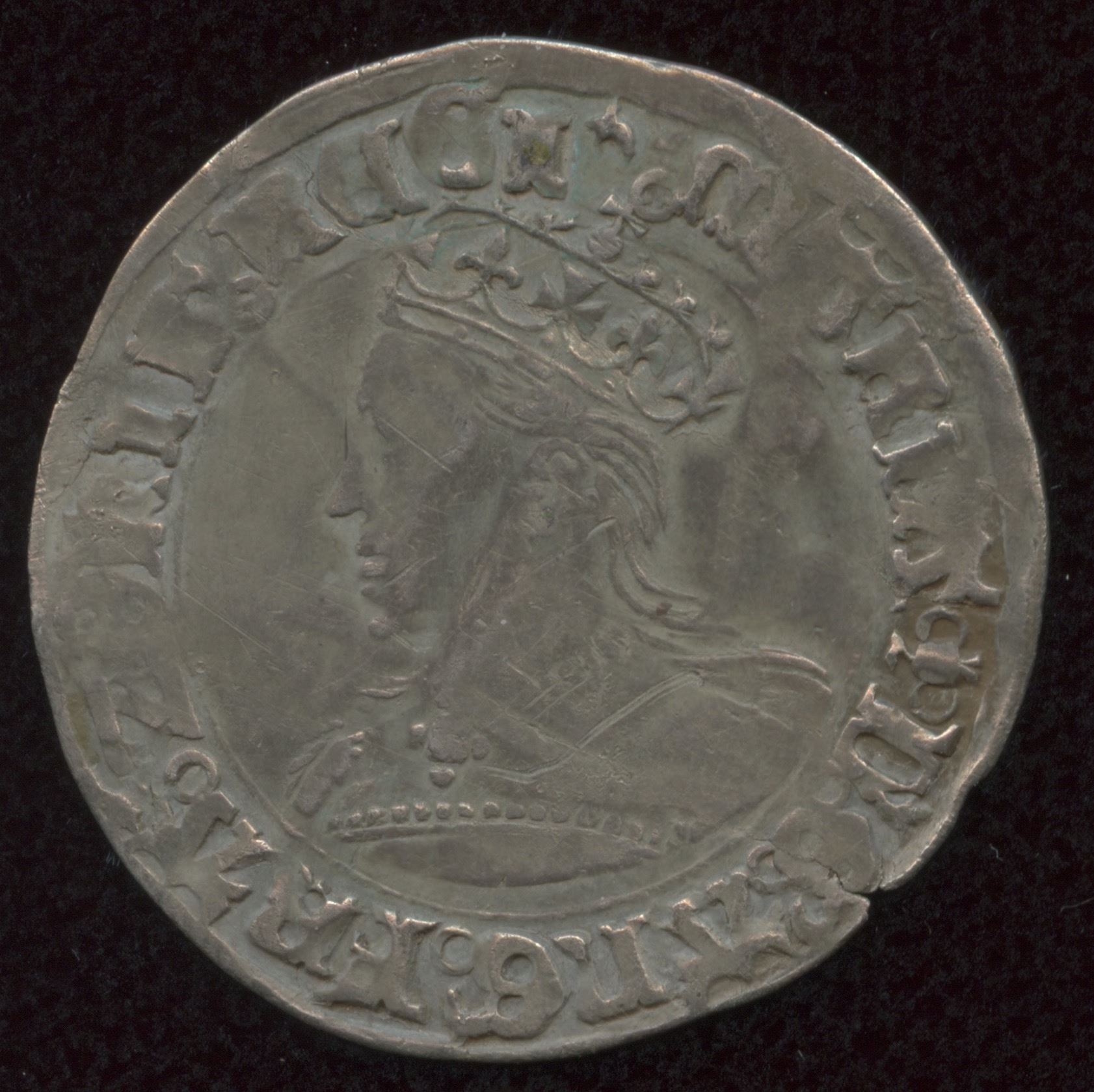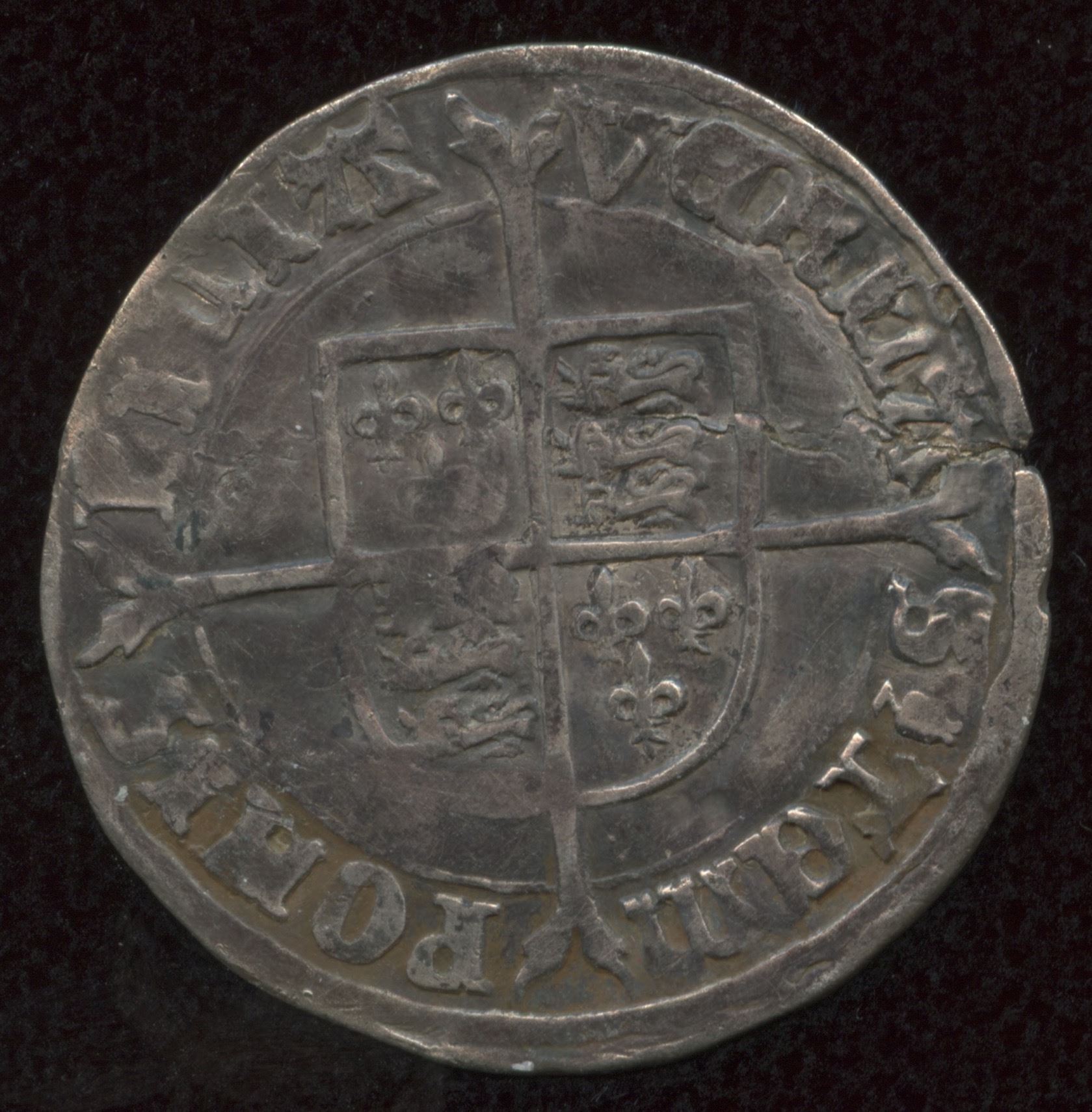 AR Groat (23mm, 1.86g). London mint. Crowned bust left Coat-of-arms over long cross fourchée. North 1960; SCBC 2492. F, toned, scratch & hit on obverse.