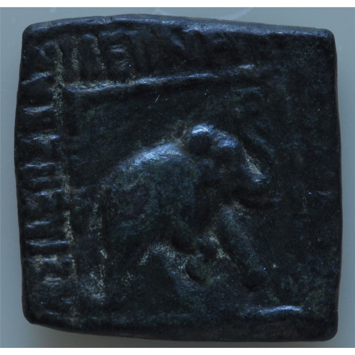 Maues (90-57 BC) - AE-Square Hemiobol Obv: Elephant charging r. Rev: King seated facing, 8.6 grams, Mitch 734A Fine.