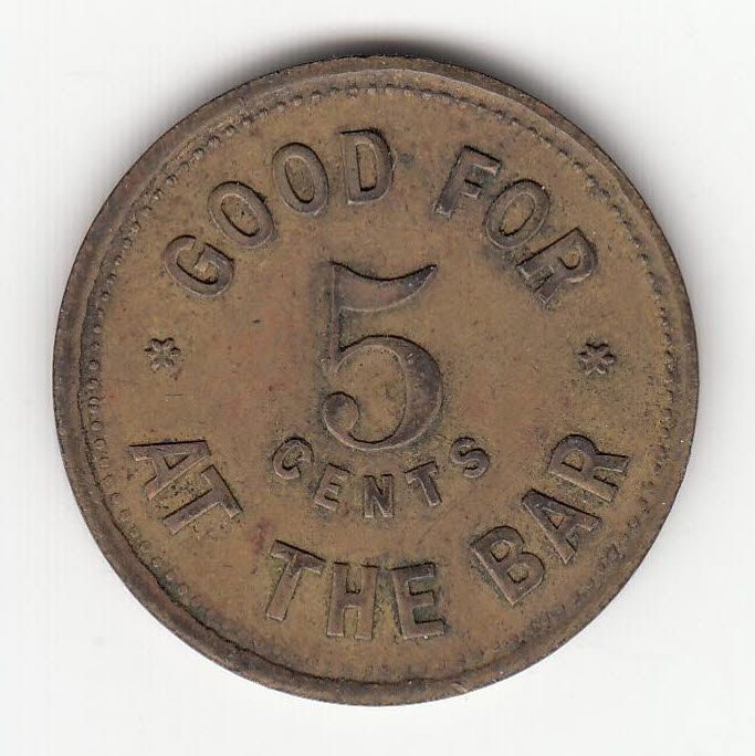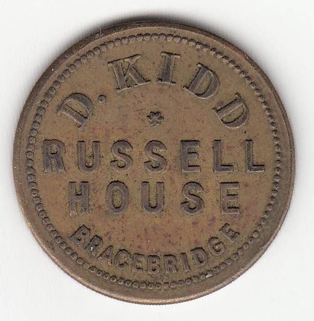 Mc 1203. D. Kidd Russell House Bracebridge, Ont Good for 5 cents at the bar. Brass, 24, EF.