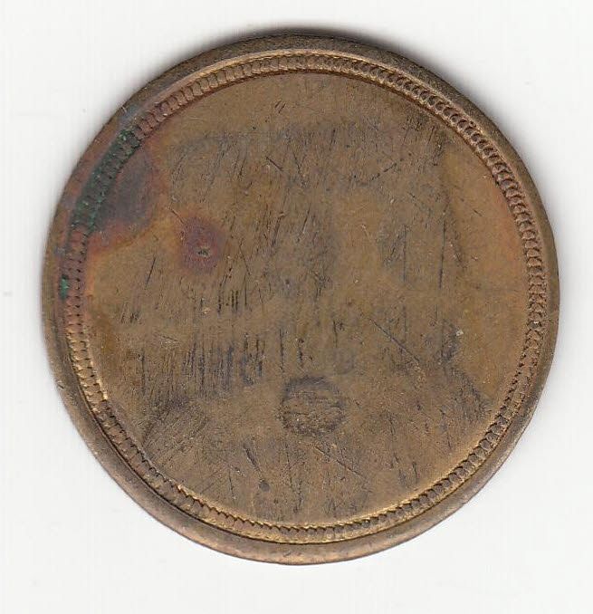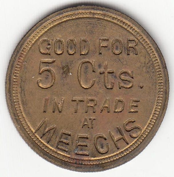 Mc 1229. Cobourg, Ont. incuse token. Good for 5 cts in trade at Meechs. Brass, 24mm, EF.