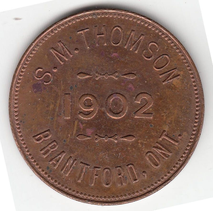 Mc 806b. S.M. Thomson/ 1902/ Brantford, Ont. Coins/ Birds/ Tokens. Copper, 35mm, Unc. Thomson's ANA number was 446 and he issued 200 pieces by Cranston. EF.