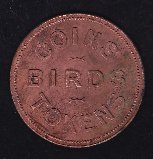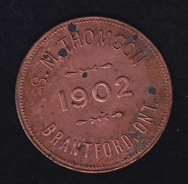 Mc 806b. - S.M. Thomson/ 1902/ Brantford, Ont. Coins/ Birds/ Tokens. Copper, 35mm, Unc. Thomson's ANA number was 446 and he issued 200 pieces by Cranston. EF.