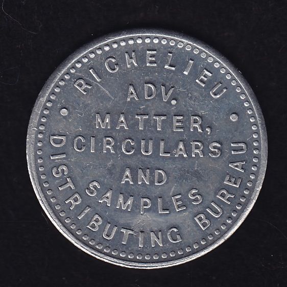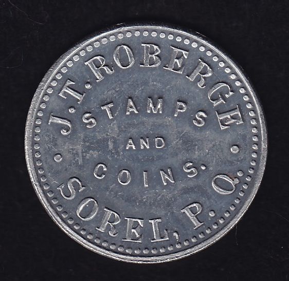Mc 807. - J.T. Roberge/ Stamps/ and/ Coins/ Sorel, P.Q. Aluminum, 30mm, Unc.
