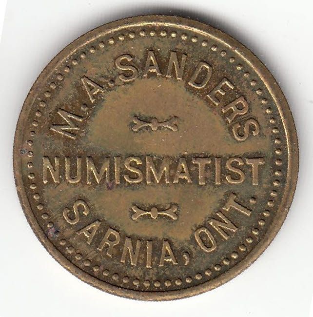 Mc 808. M.A. Sanders/ Numismatist/ Sarnia, Ont. Brass, 25mm, Unc. Sanders' ANA number was 246. EF.