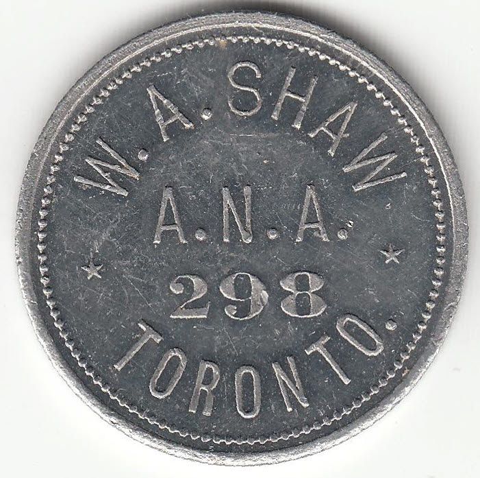 Mc 813. W.A. Shaw, Toronto, A.N.A. 298. Alum, 28mm, Unc.