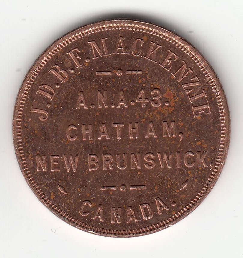 Mc 816. J.D.B.F. MacKenzie, Chatham, NB. Copper, 30mm, Unc. 100 struck by Cranston. EF.