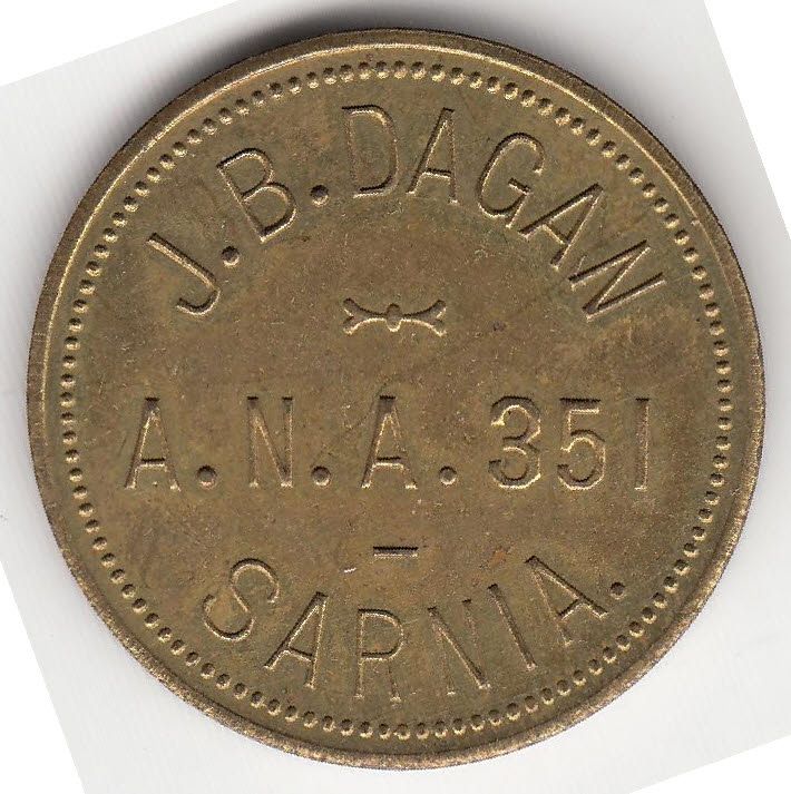 Mc 821. J.B. Dagan, Sarnia, A.N.A. 351. 25 struck, brass, 28mm, EF.