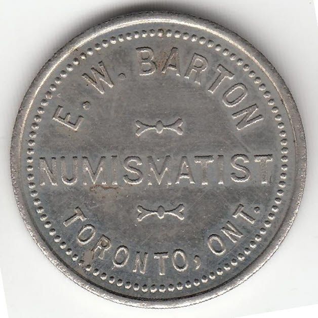 Mc 826. E.W. Barton/ Numismatist/ Toronto, Ont. WM, 25mm, EF. Barton's ANA number was 362 (1903) and he issued 75 pieces in WM.