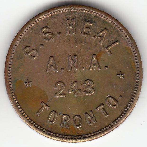 Mc 835. S.S. Heal/ A.N.A./ 243/ Toronto. Rev: Coins, Medals and Tokens. Brass, 25mm, Unc. McColl claims 50 struck.
