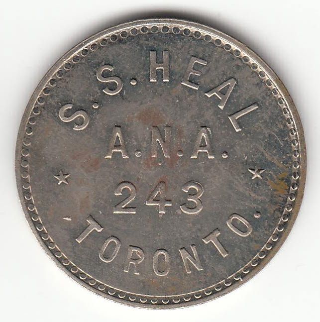 Mc 839. S.S. Heal/ A.N.A./ 243/ Toronto. Rev: Good for/ 5c/ in Trade. WM, 25mm, AU. McColl claims 25 struck.