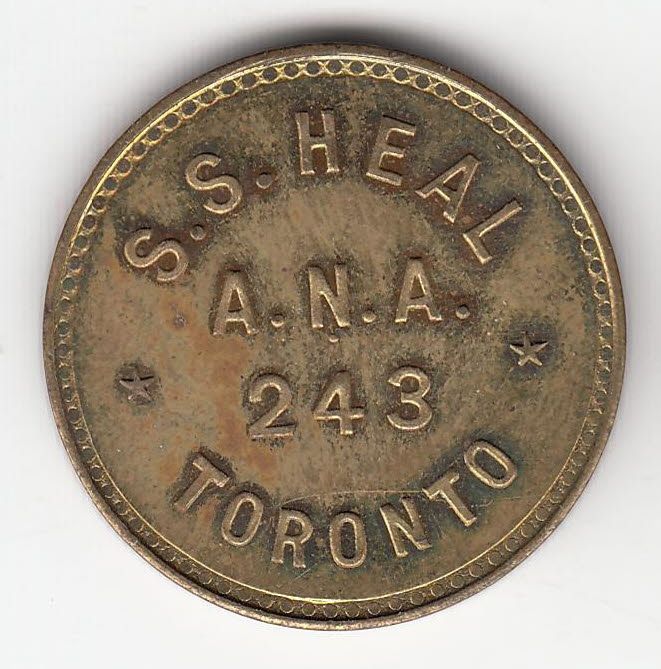 Mc 840. S.S. Heal/ A.N.A./ 243/ Toronto. Rev: Coins, Medals, (Oak Leaf) Tokens. Brass, 25mm, UNC.