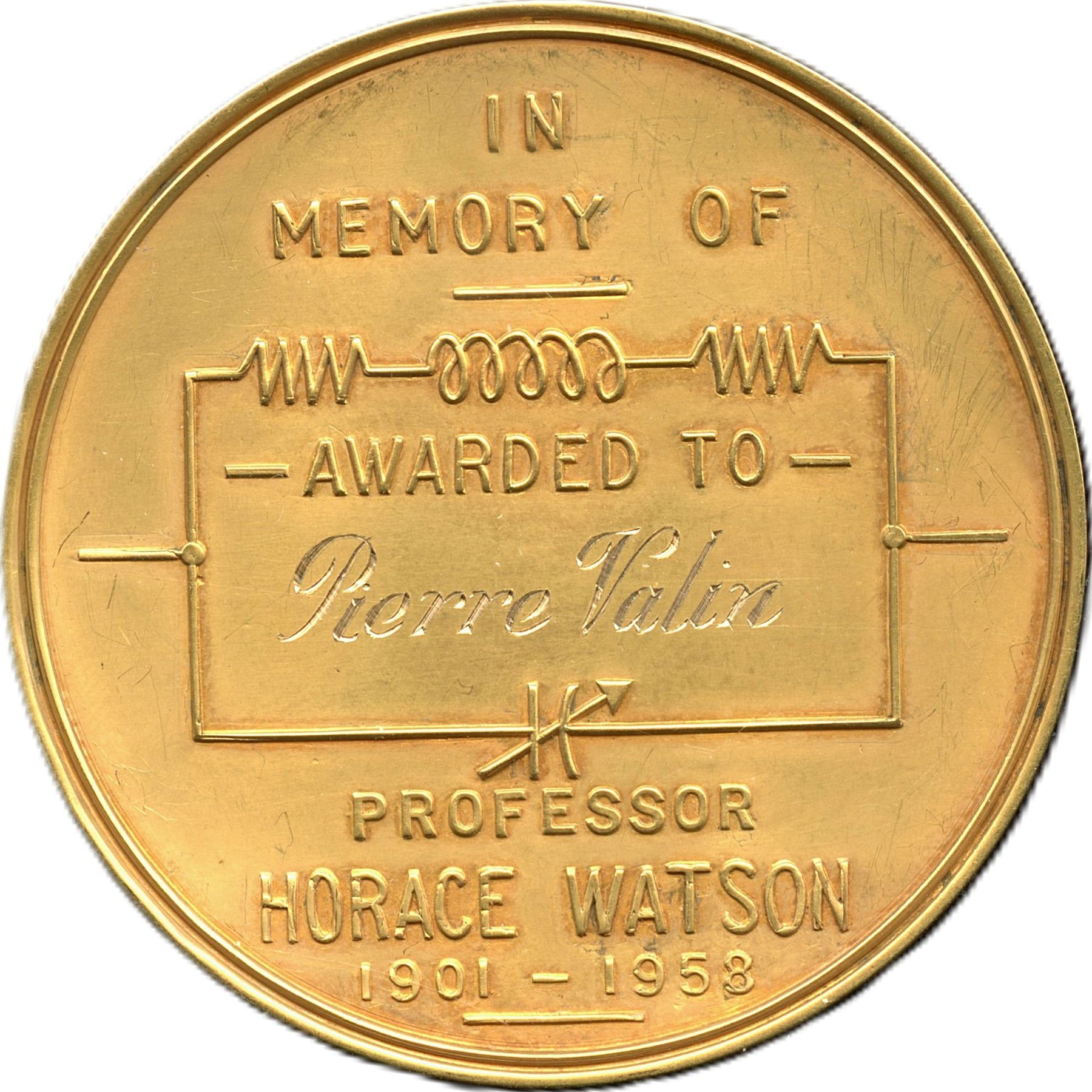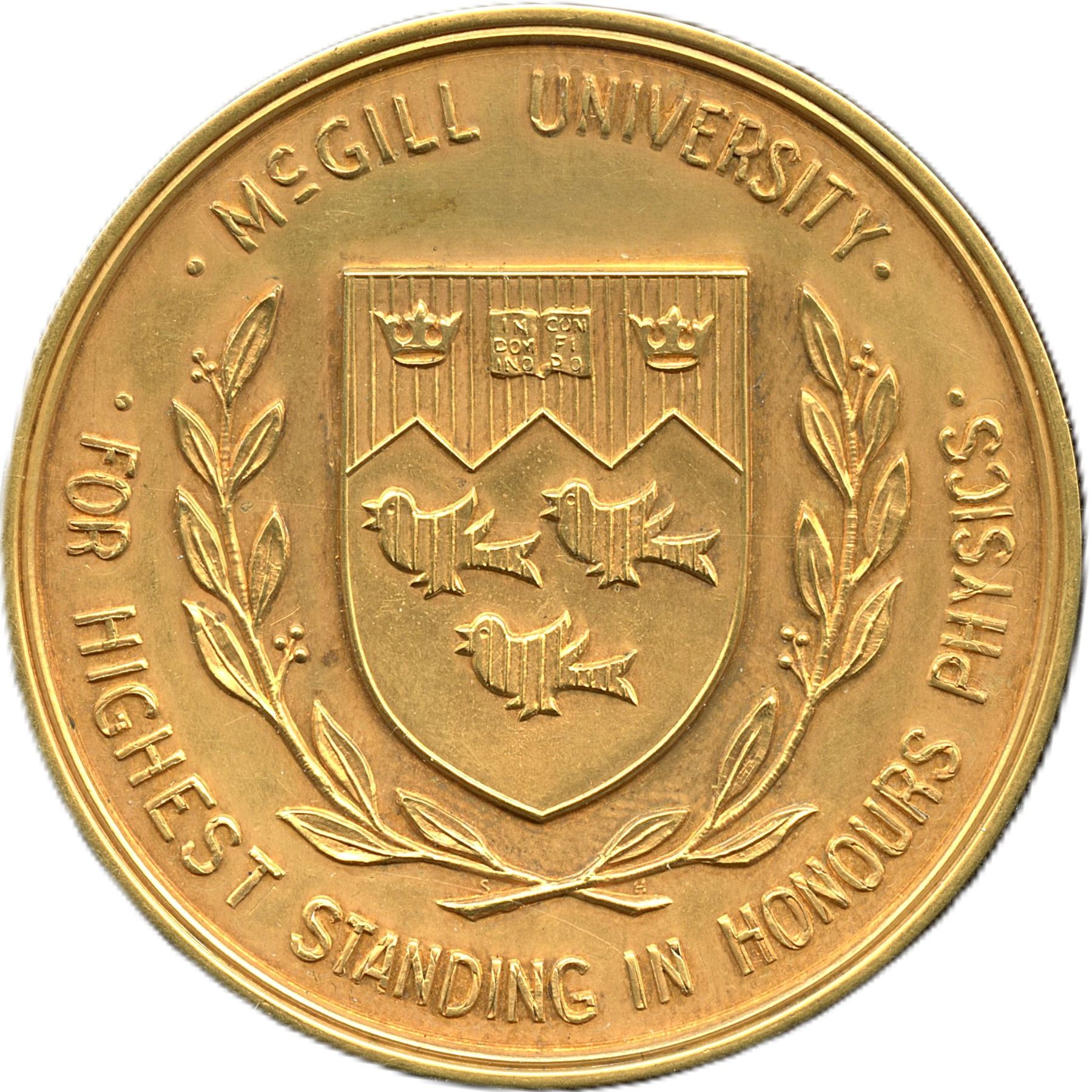 XRF analysis revealed a purity of 62.03% (14K+), 44.1mm, 45.2g (0.9014AGW), Signed Birks 10K on edge. Awarded to "Pierre Valen", The Horace Watson Medal is a prestigious award presented to the undergraduate student with the highest First Class standing in the Honours Physics program. Established in 1959 by Jack Watson to honor his brother, this award recognizes academic excellence within the Department of Physics. Original semi-gloss surfaces, UNC. 1pc. From the Geoffrey Bell Collection.