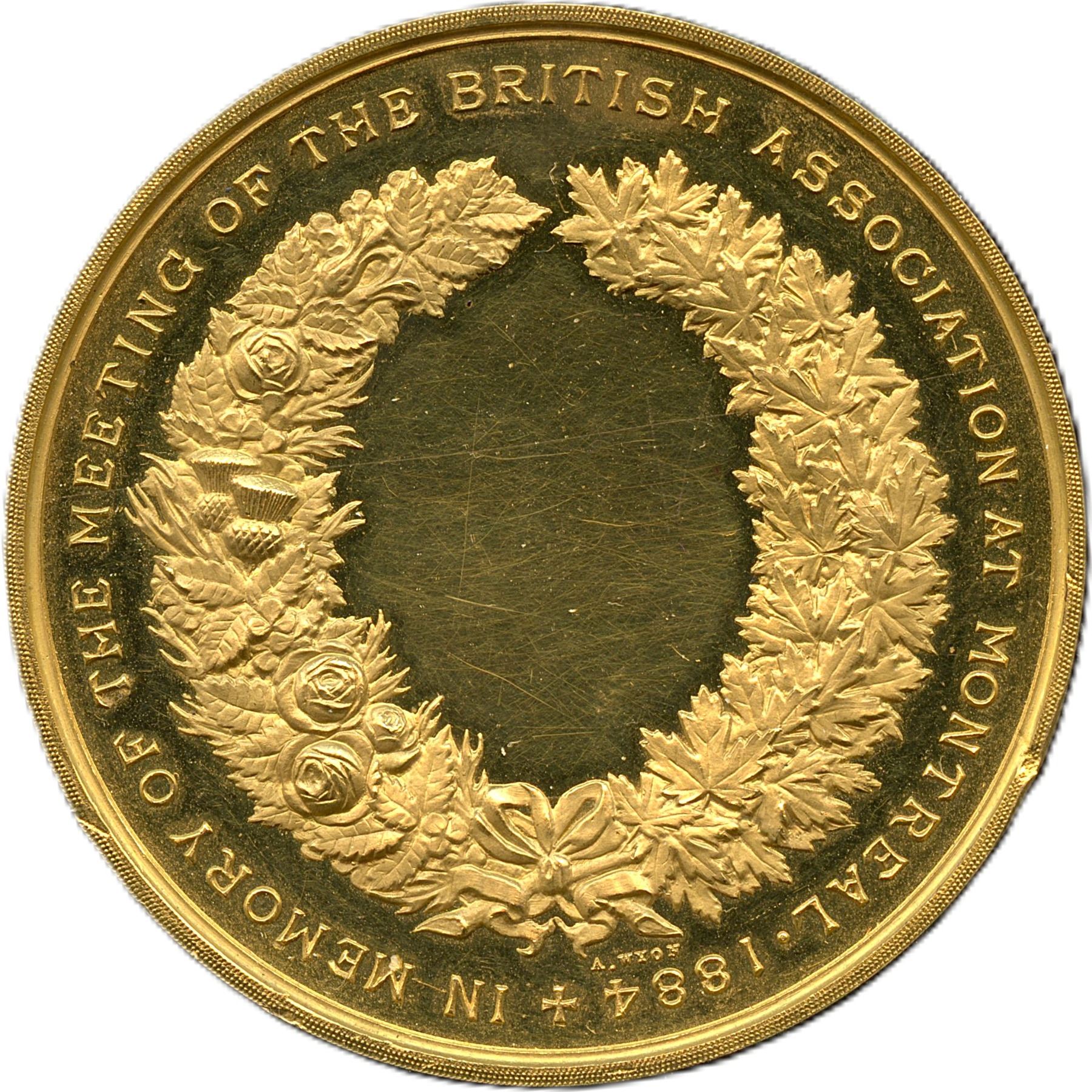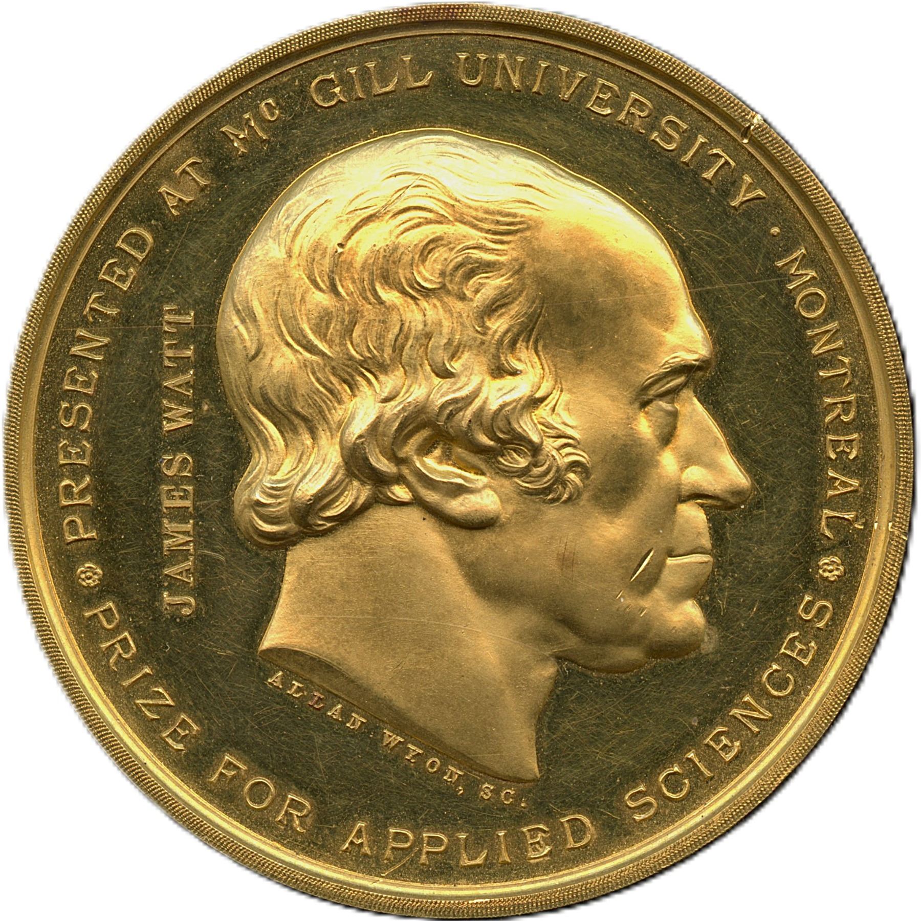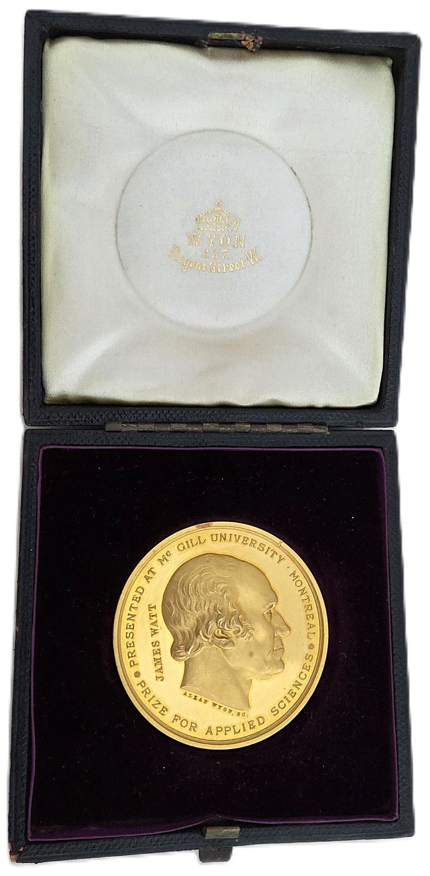 XRF analysis revealed a purity of 98.96% (23K+), Not in LeRoux or Breton. 44.9mm, 52.9g (1.6831AGW), Edge engraved: AWARDED TO S. M. LOVELACE 1888. Signed ALLAN WYON. The medal commemorates the first meeting in North America by the British Association for the Advancement of Science (BAAS) in 1884, largely orchestrated by Nova Scotian, Sir John William Dawson who became its first North American president in 1885. The BAAS conferences started in the UK in 1831, and 1884 was the first time that it was held in Canada. It was to be held in Toronto in 1897 and 1924, and Winnipeg in 1909.The Watt Medal is awarded every two years to an engineer of any nationality who is deemed worthy of the highest award that the Institution can bestow. Housed in its original black leather wooden box with purple velvet and white satin interior (Wyon 287 Regent Street. W.). An exceptionally pleasing example, reflective fields contrast against frosted relief elements. Wiped at some point long ago, a rim nick at 1 o'clock and a heavy indentation on cheek, but they pose little distraction. UNC. 1pc. From the Geoffrey Bell Collection.