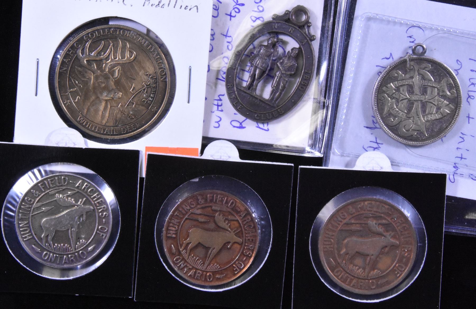 Great Britain National Rifle Association, 1860, AR, 35mm, obv. Two figures in hollowed out centre, oval with loop at top, NRA Rifle Clubs 1860, uniface, EF. 14.1gms; 30mm Love token depicting hunting scene and engraved initials on reverse; 3x Hunting & Field Archers of Ontario—M.M. Field 1949, F.S. B.H. 1955, Field 1952; N.A.H.C. Medallion Whitetail Deer / North American Hunting Club