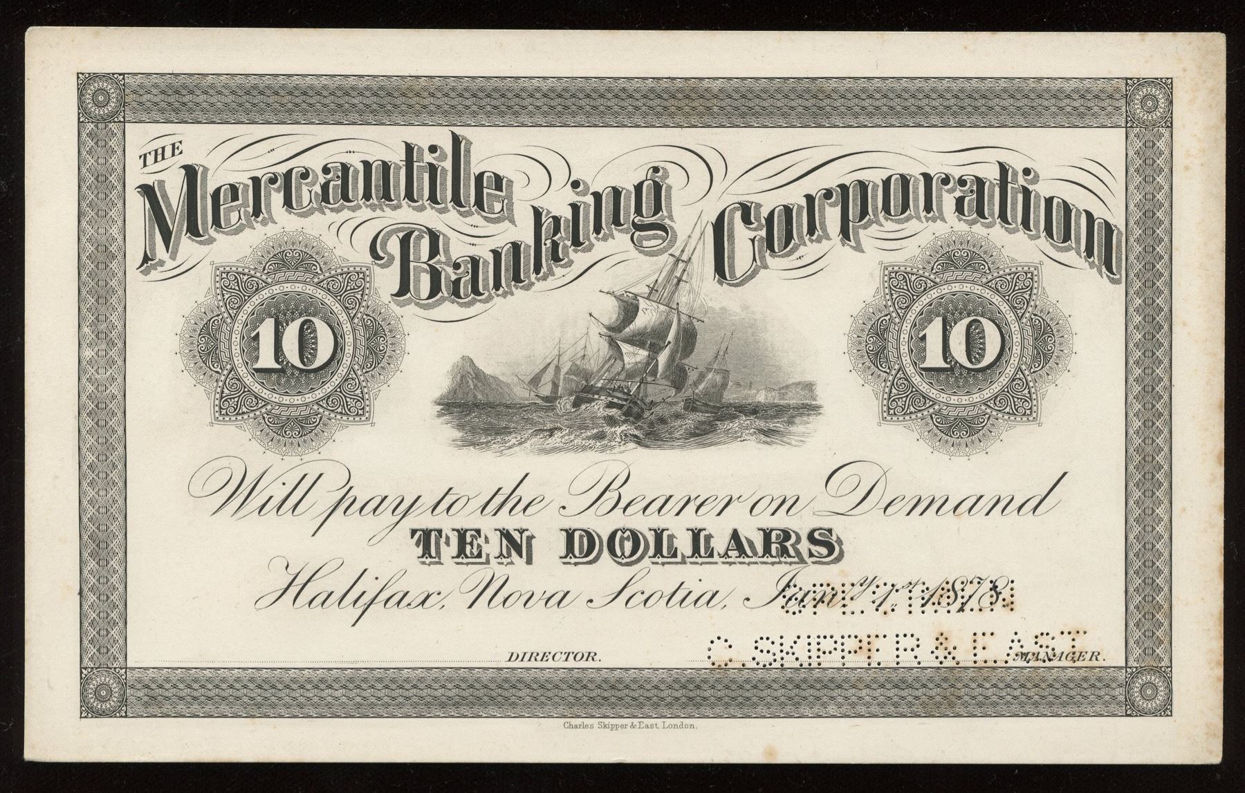 Halifax, Nova Scotia. Specimen C. Skipper & East hole punched specimen. Uncirculated with some brown spots. Wonderful sailing ship vignette on a piece that is rarely offered.