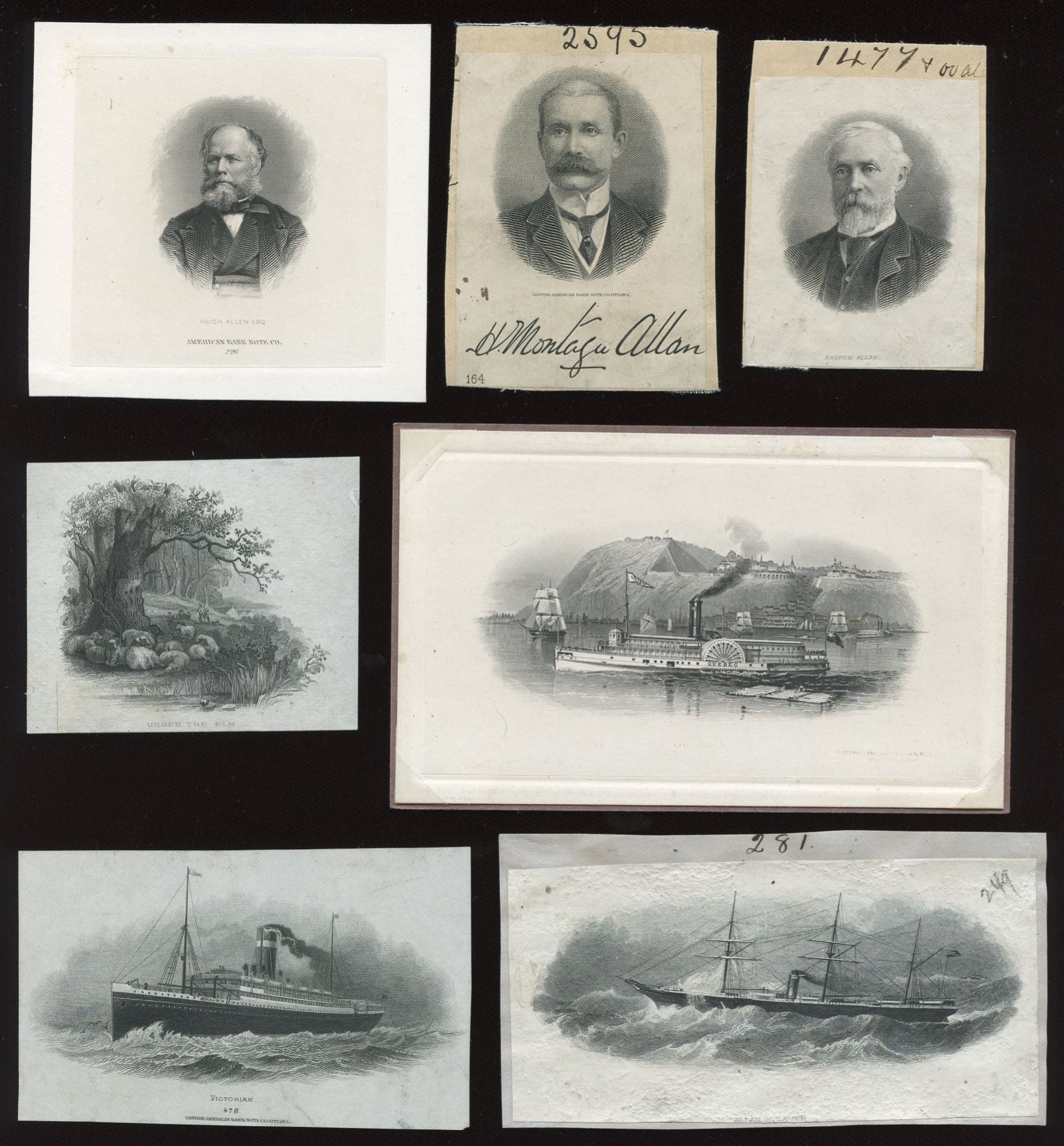 Merchants Bank of Canada, portraits: Hugh Allan; Andrew Allan; Montague Allan, the last two cut down and numbered, the Montagu Allan has his engraved signature below; steamship (1868 and 1886 $5); paddlewheel steamer (1886 $50), "Steer's Head and "Under the Elm" (1907 $20 face and back); "Monarch of the Glen" (1907 $50); steamship "Victorian" (1906 and 1916 $5). All except Hugh Allan are BABN engravings. Total of nine vignettes.