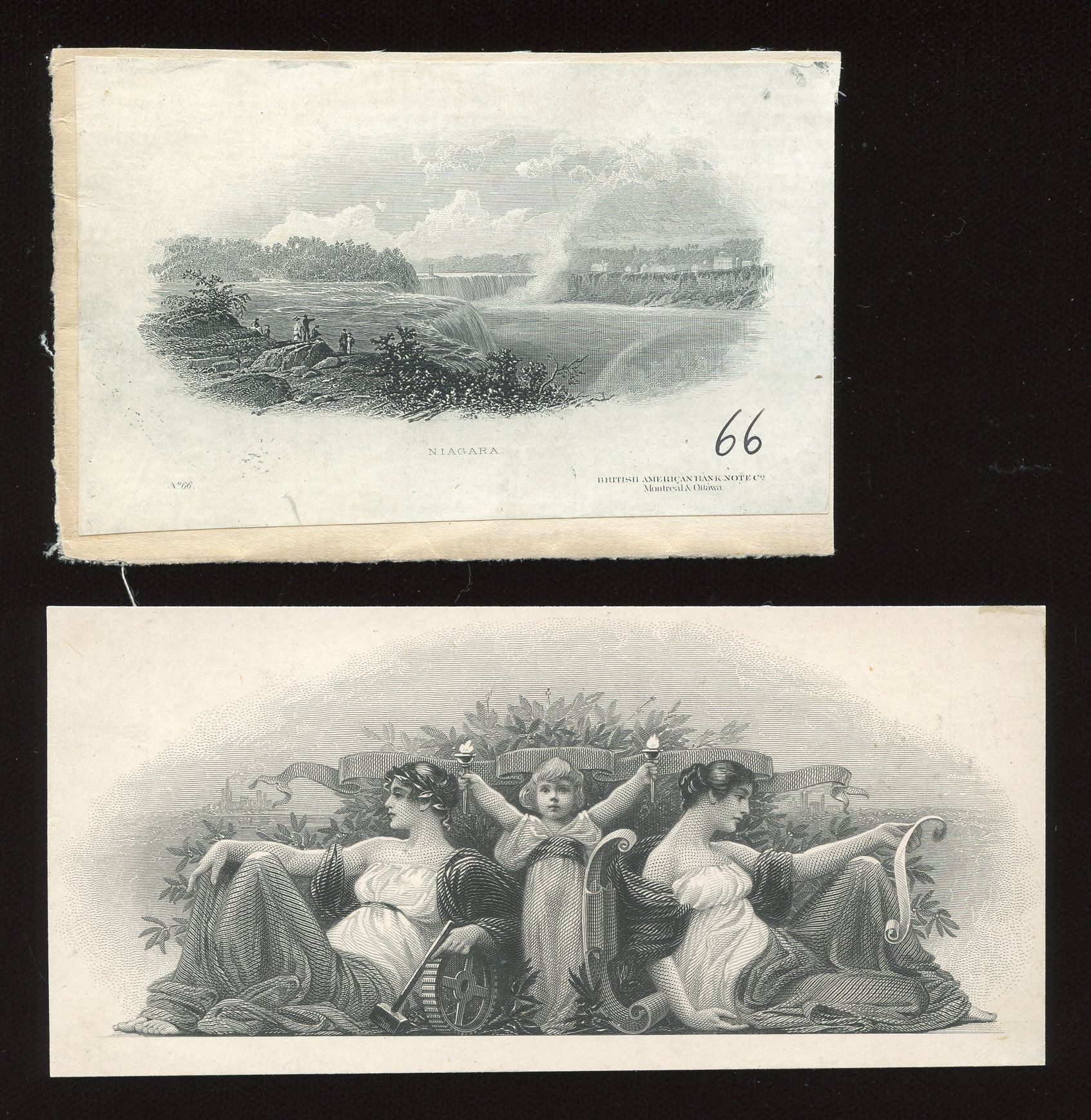 Metropolitan Bank (Toronto) die proof vignette ($5 1902) and Niagara District Bank, Niagara Falls vignette ($10 1872), BABN #66, number written on the latter, which has been cut down and mounted on canvas. Two challenging items.