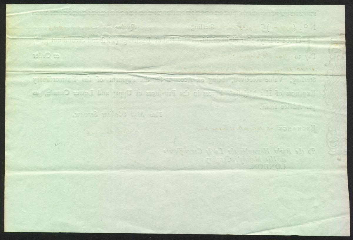 Military Bills of Exchange were used prior to 1813 in Quebec to purchase supplies and pay troops there. This specimen dated September 1, 1806 is interesting because it is for 2500 pounds, a huge sum at that time. It is signed by John Craigie who was Commissary General from 1784 to 1808. He was dismissed at this time for misappropriating funds. A rare military Canadian document and historically important.*