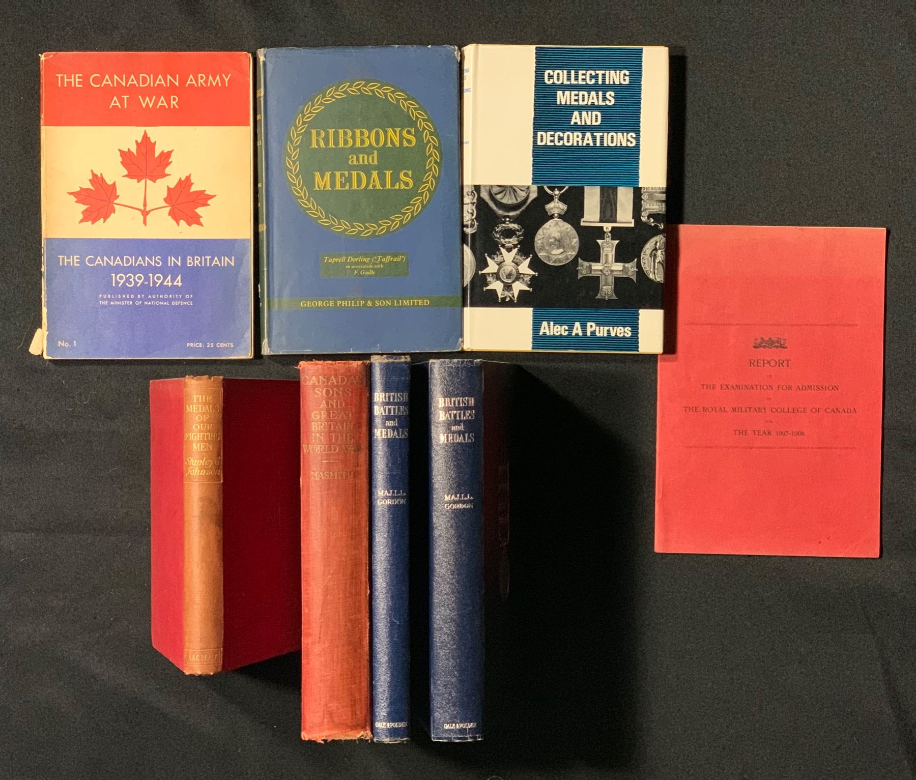 British Battles and Medals, Gordon, 1947 edition; Same 1950 edition; The Medals of our Fighting Men, Johnson; Collecting Medals and Decorations, Purves; Ribbons and Medals, Dorling; Report of The Examination For admission to The Royal Military College of Canada, The Year 1907-1908; The Canadian Army At War; Canada's Sons and Great Britain In The World War ( rare book)