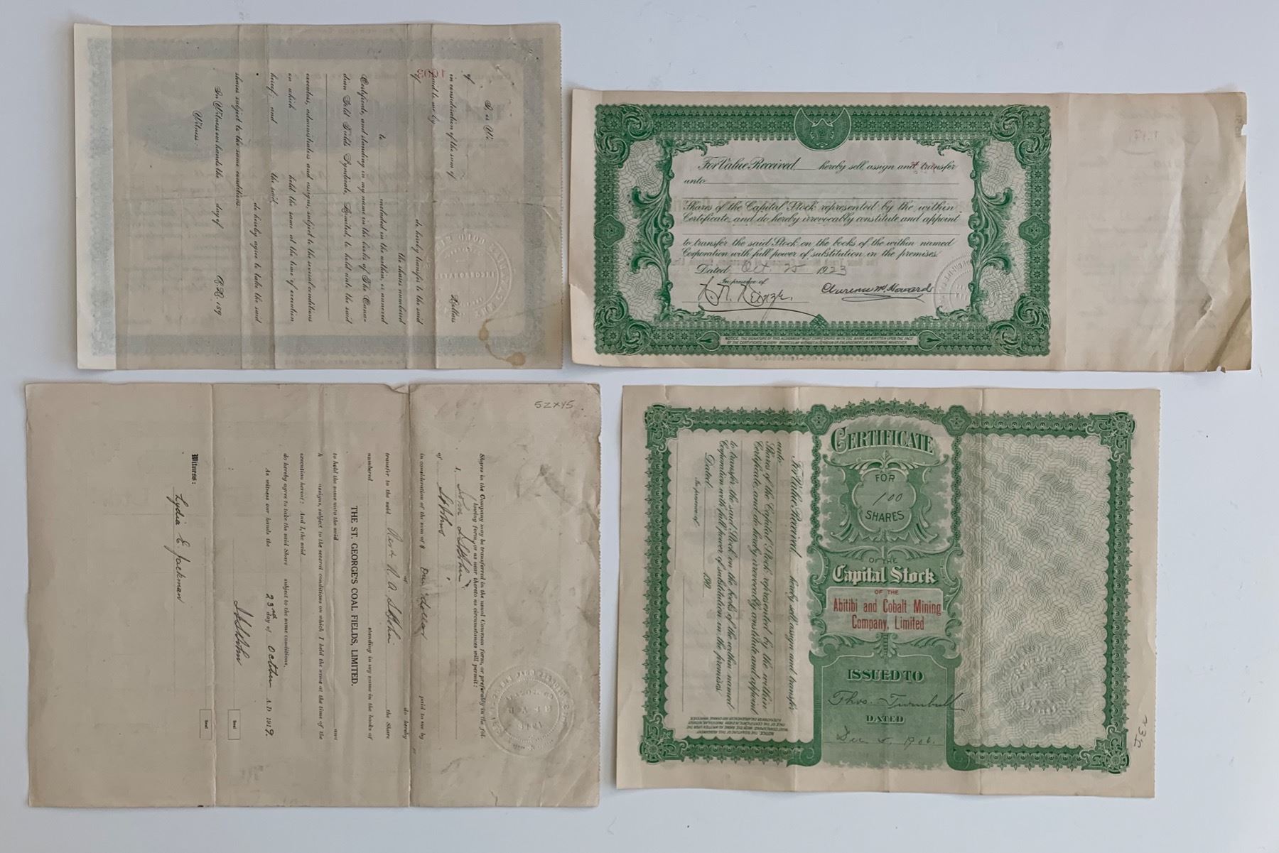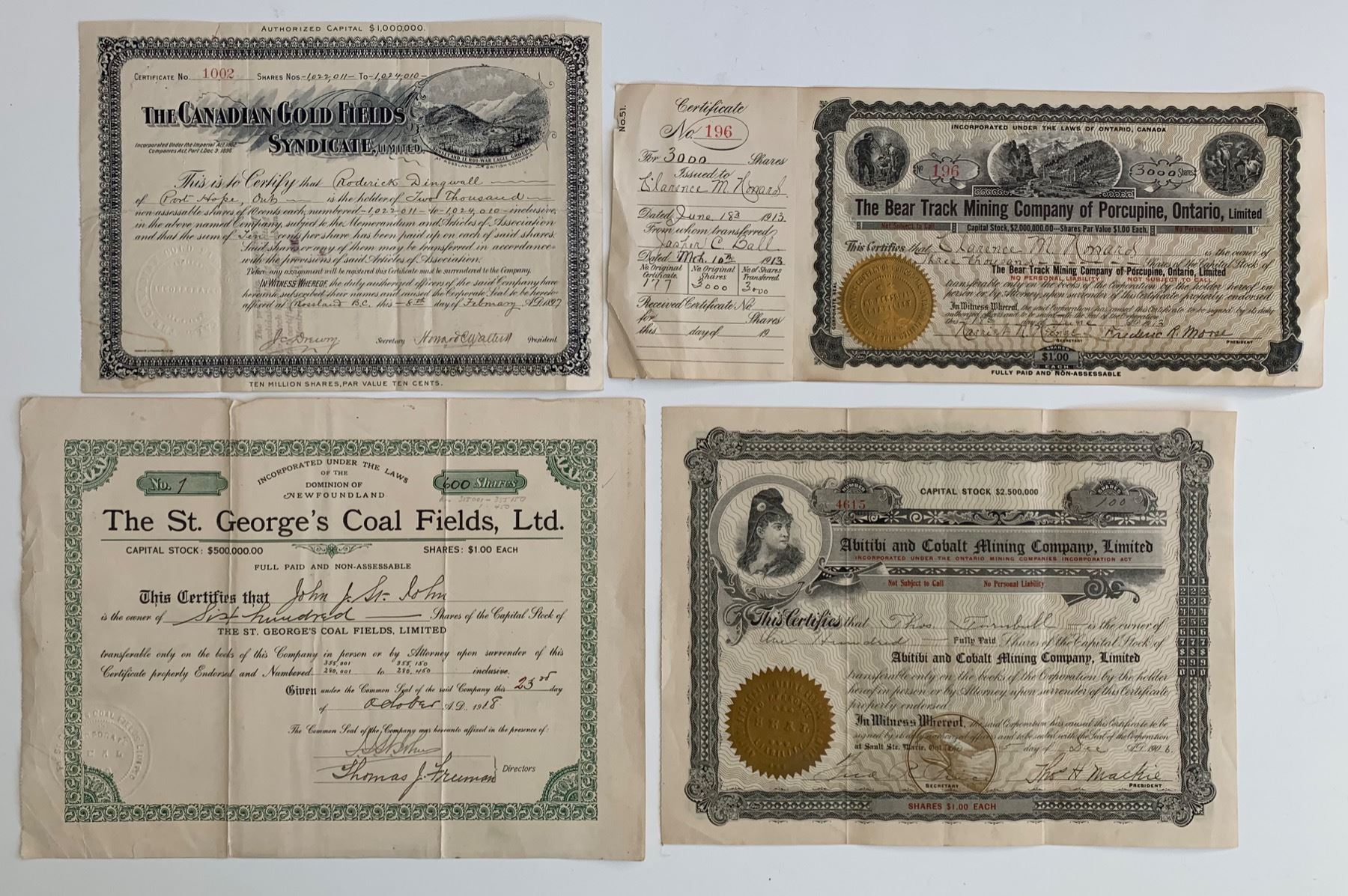 Includes: The St. George's Coal Fields, Newfoundland. Canadian Gold Fields Syndicate, Port Hope, ON. The Bear Track Mining Company or Porcupine, Ontario. Abitibi Cobalt Mining Company, Sault Ste. Marie, ON. 4 Pcs.