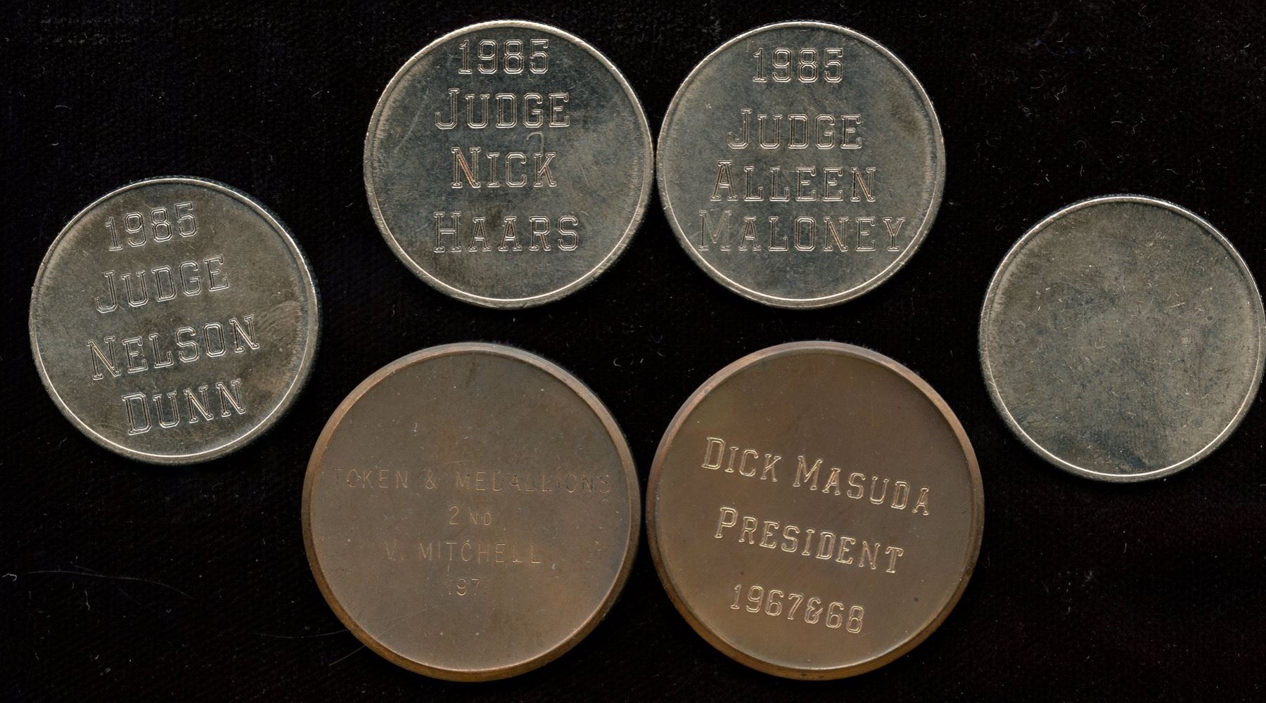President's bronze medal to Dick Masuda; Token & Medal second place display award in bronze to Vince Mitchell, 1971; 4 judges awards in nickel to Nick Haars, Allan Maloney, Nelson Dunn and one blank uniface copy.
