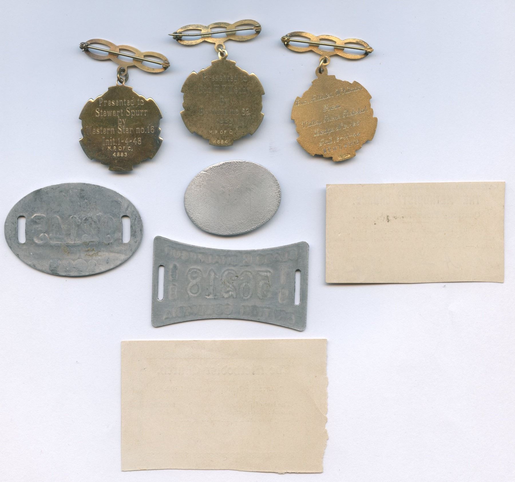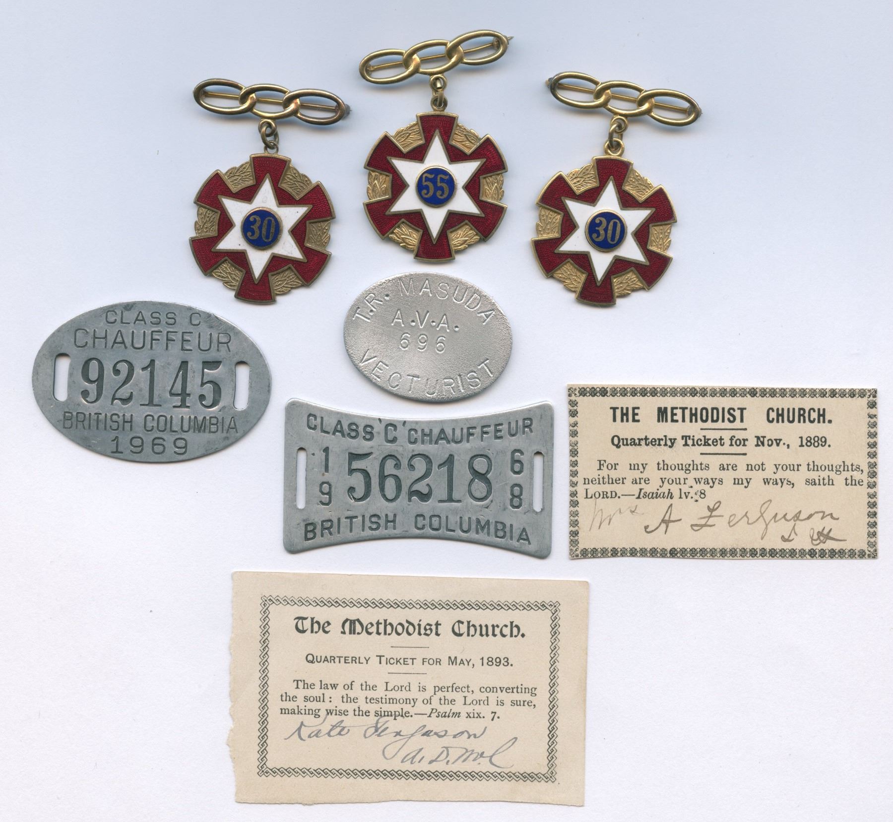 Three lodge badges, two chauffeur bades, and a business tag for V.R. Masuda, Vecturist. 1889 & 1893 Methodist Church Quarterly tickets. 8 pcs.