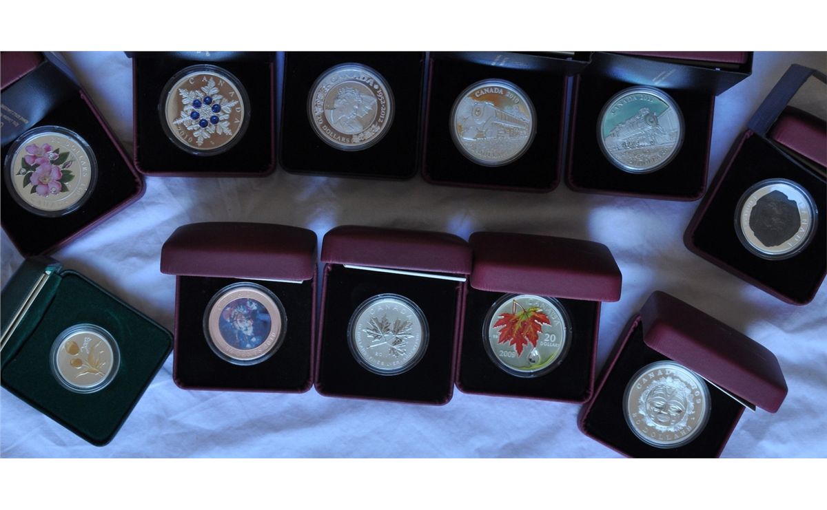 Includes: 2002 Fifty Cent Golden Tulip. 2009 $20 Summer Moon Mask. 2009 $20 Crystal Raindrop. 2010 50 Cent Santa and the Red-nosed Reindeer. 2010 $4 Euoplocephalus. 2010 $20 Selkirk. 2010 $20 Blue Crystal Snowflake. 2011 $20 Rose. 2011 $10 Maple Leaf Forever. 2011 $20 D-10. 2012 $20 Queen's Jubilee. 11 Pcs.