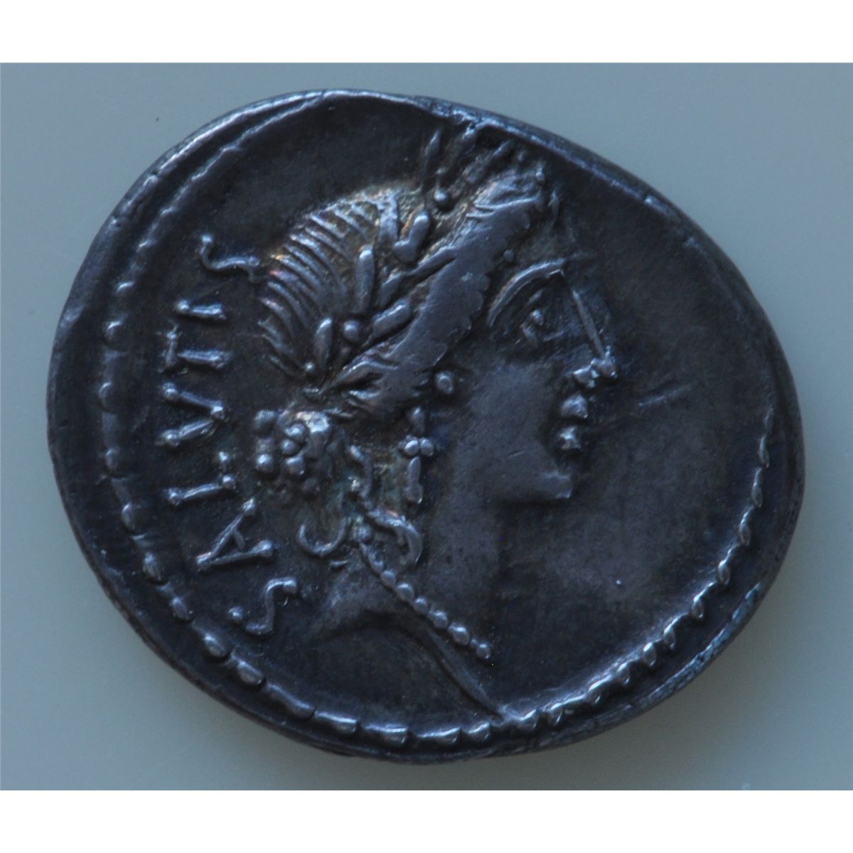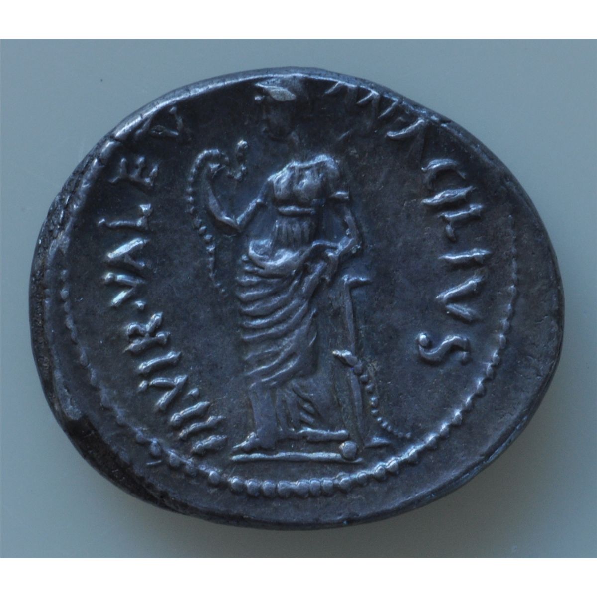 Mn. Acilius Glabrio (49 BC) - AR-Denarius Obv: Laur. Head of Salus r., SALVTIS behind. Rev.: Valetudo stg. l. , holding snake and leaning on column. MN ACILIVS III VIR VALETV on either side of goddess. Ex:Harlan Berk S-412 Craw 442-1A. Toned EF.