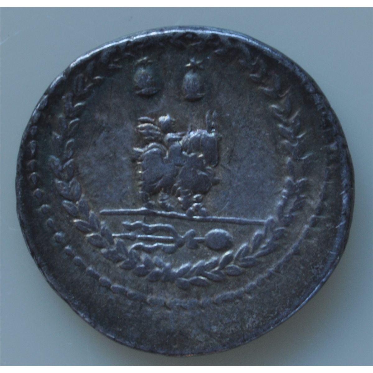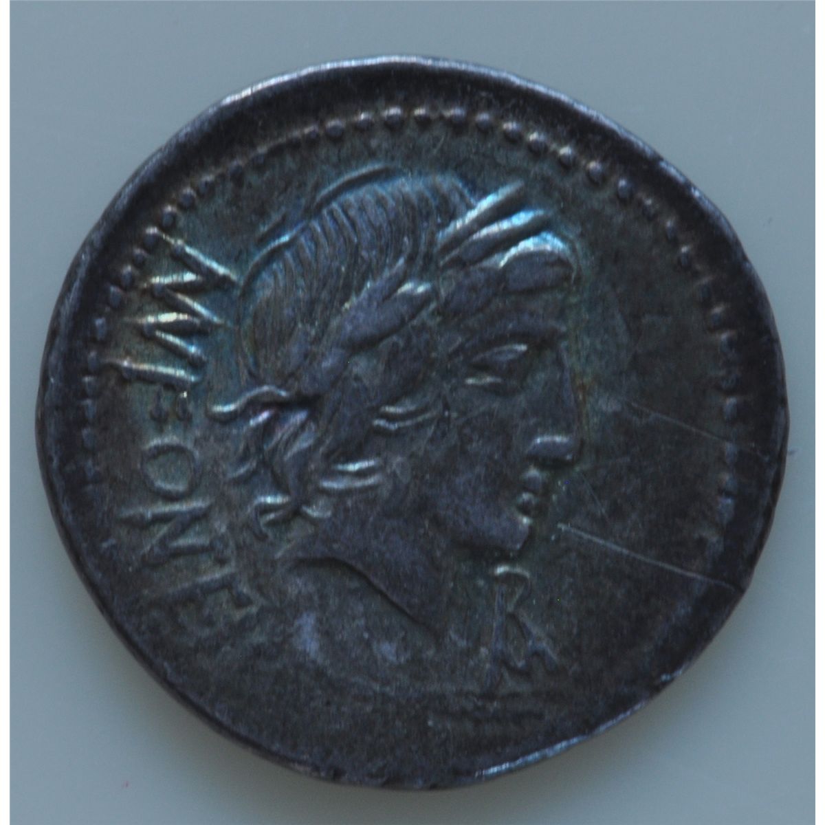 Mn. Fonteius C.f. (85 BC) - AR-Denarius Obv: Laur. Head of Apollo r., thunderbolt below, AP monogram under chin and MN FONTEI C F behind head Rev: Cupid seated on goat stg. r., pilei of the Dioscuri above, thyrsus of Bacchus in exerge. Large flan 3.8 grams S-271 VF.