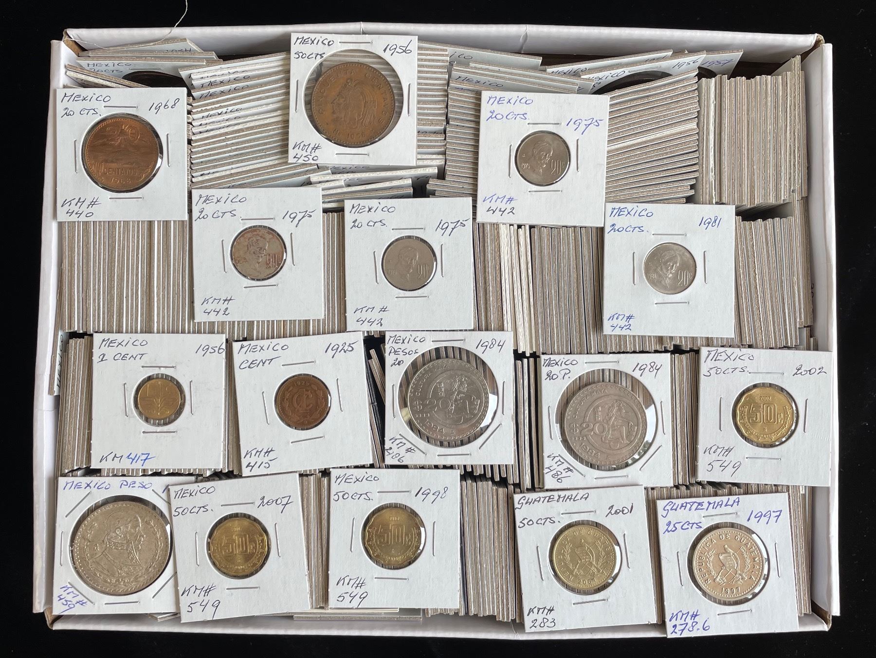 Mexico, Guatemala, Guyana, Mexico. Coins are identified in 2x2’s, with over 1300 coins and a net weight of 20 lbs in a double level box. The Hospital for Sick Children Foundation Collection.