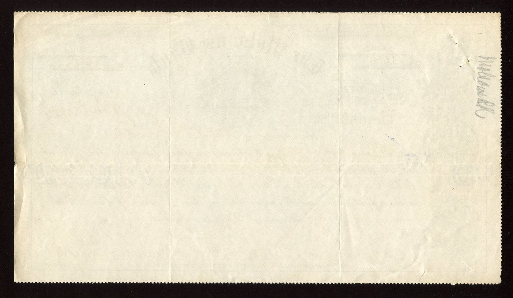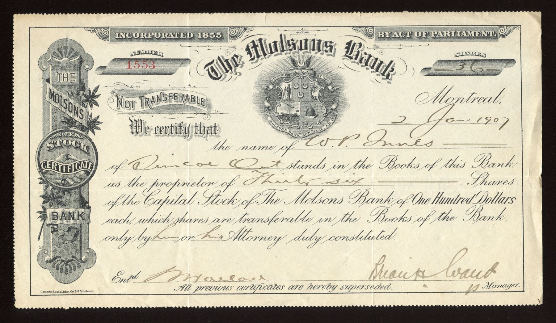 Molsons Bank, share certificate, 1907, with bank crest and fancy end panel; small tear at bottom edge.