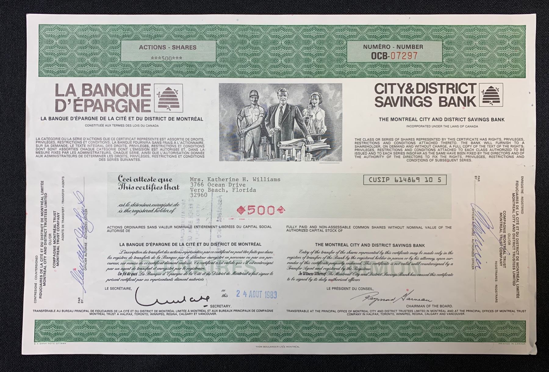 Montreal City & District Savings Bank 500 shares Green 1983 Vignette of three people w/cityscape in foreground. #OCB 07297 EST $100-$200