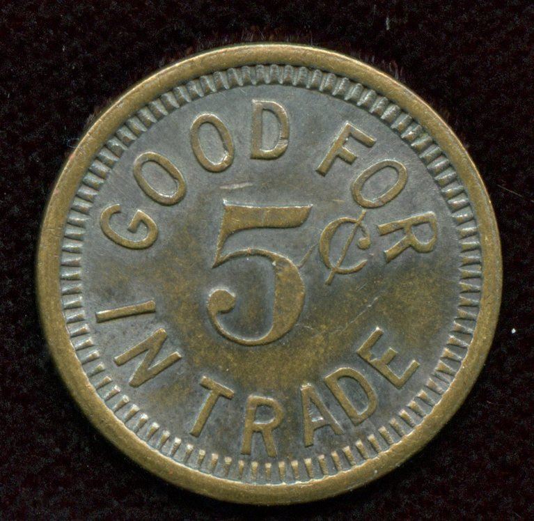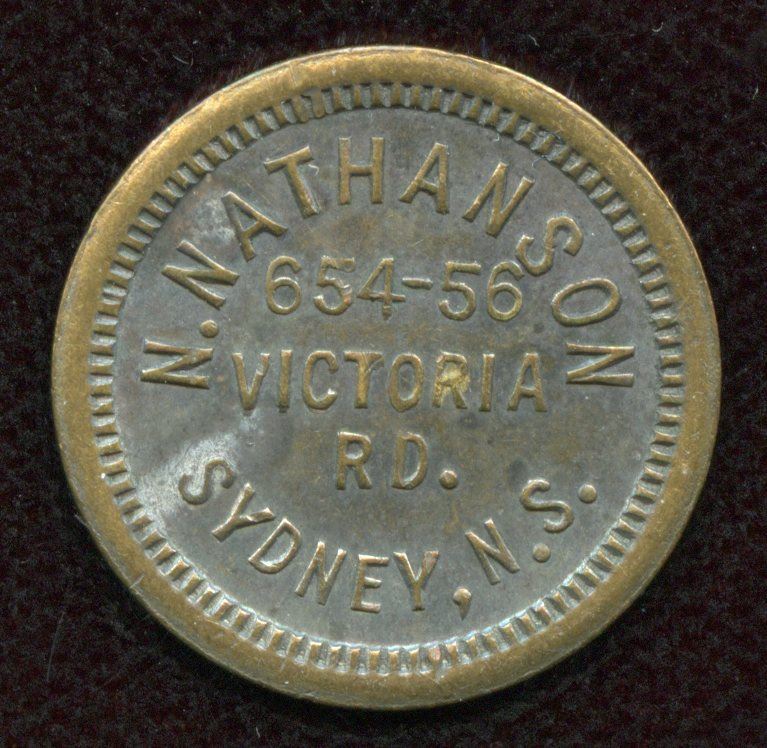 Brass. Nathanson ran a bookstore in the early part of the 1900's. This is a scarce token not easily obtained. EF+.