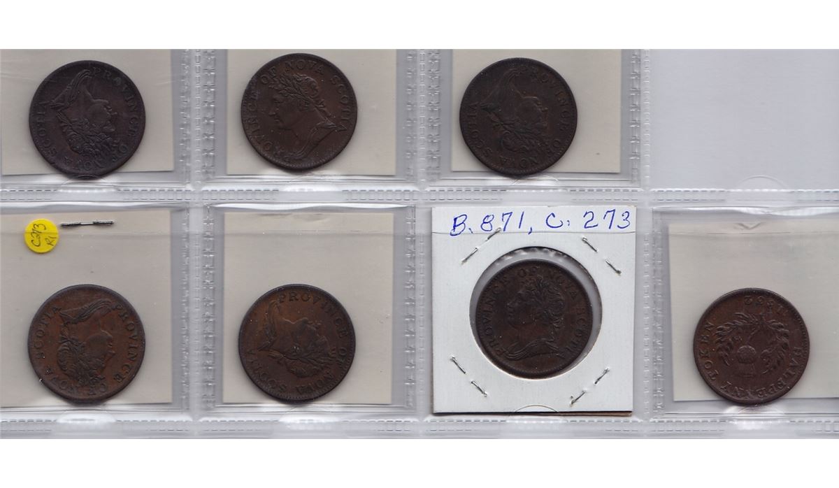 N.S. Token Lot Includes: BR 871 (1832), N.S. Halfpenny, Courteau 266, NS-1D2, strong EF; Courteau 269, CH NS-1D2, abt EF; Courteau 272, CH NS-1D3, solid EF; Courteau 273, CH NS-1D3, EF; another Courteau 273, some details may be slightly different, CH NS-1D3, EF; Courteau 274, CH NS-1D3, abt EF; Courteau 275, CH NS-1D3, EF. Varieties cannot be absolutely confirmed, but a very nice lot with six different. 7 Pcs. altogether.
