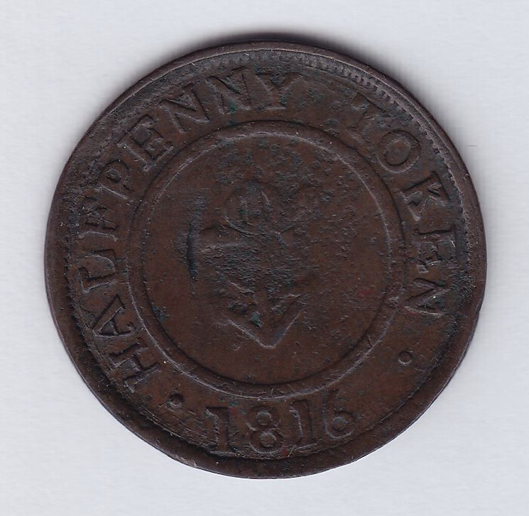 VF in point of wear, but with some localized pitting and planchet flaws. Listed by Courteau as a "Non-Local Token". The third offering of this rare piece by Bell Auctions in as many years. An EF piece in the Barnes collection (Spring 2014) brought $9,500, and a Fine specimen in the Bell collection (Spring 2015) brought $7,250. Reverse slightly off centre and obverse showing greater wear, both as often the case. Flaws on this piece appear to be a match for the peice from the Wilkinson collection, Hoare 61 (Feb. 1999), Lot 695.