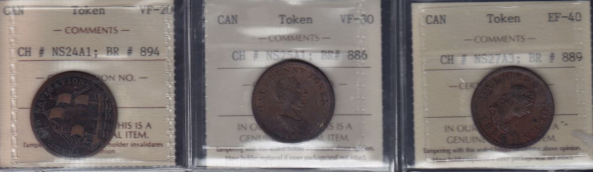 NOVA SCOTIA MERCHANT TOKENS - Three ICCS graded merchant tokens.
