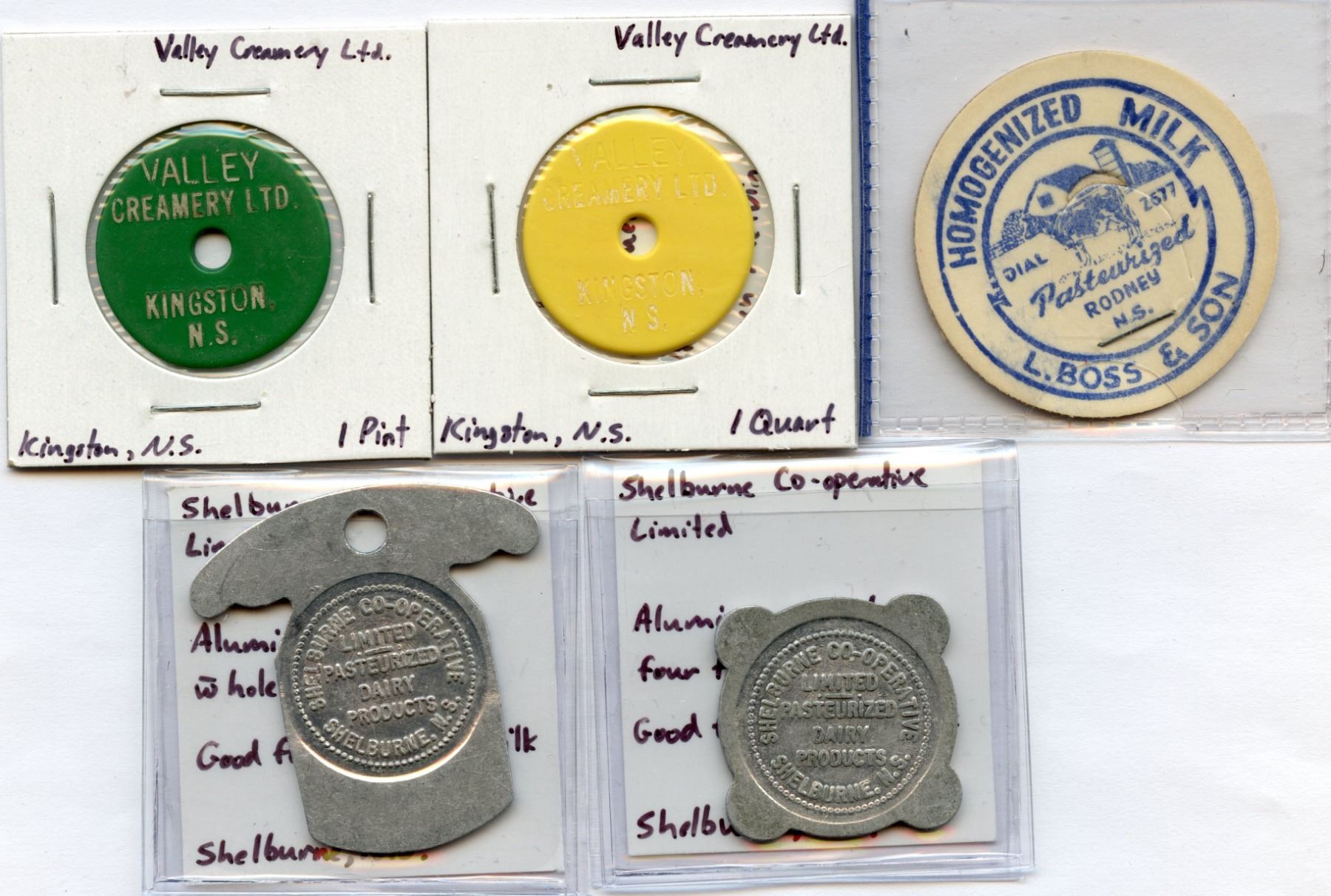 Lot of four Nova Scotia dairy tokens, plus a milk bottle cap. Two are plastic tokens from the Valley Creamery, in Kingston, NS. The other two are very scarce aluminum tokens from Shelburne. The milk bottle cap is from L. Boss and Son, Rodney, NS. The two Shelburne tokens are unlisted (uncatalogued) by Allen but both are listed in Melvin Reiter's catalogue with rarity values of 10.