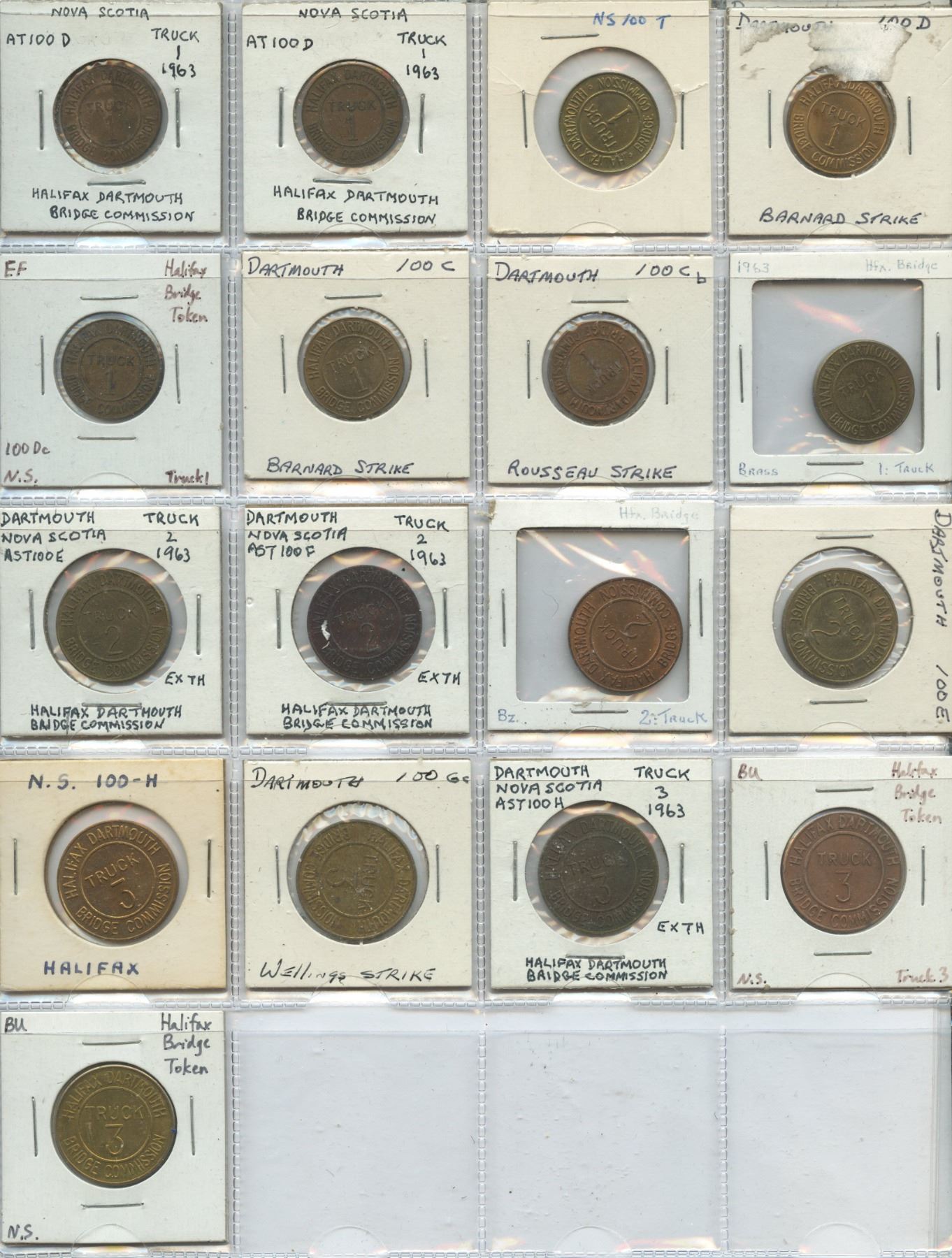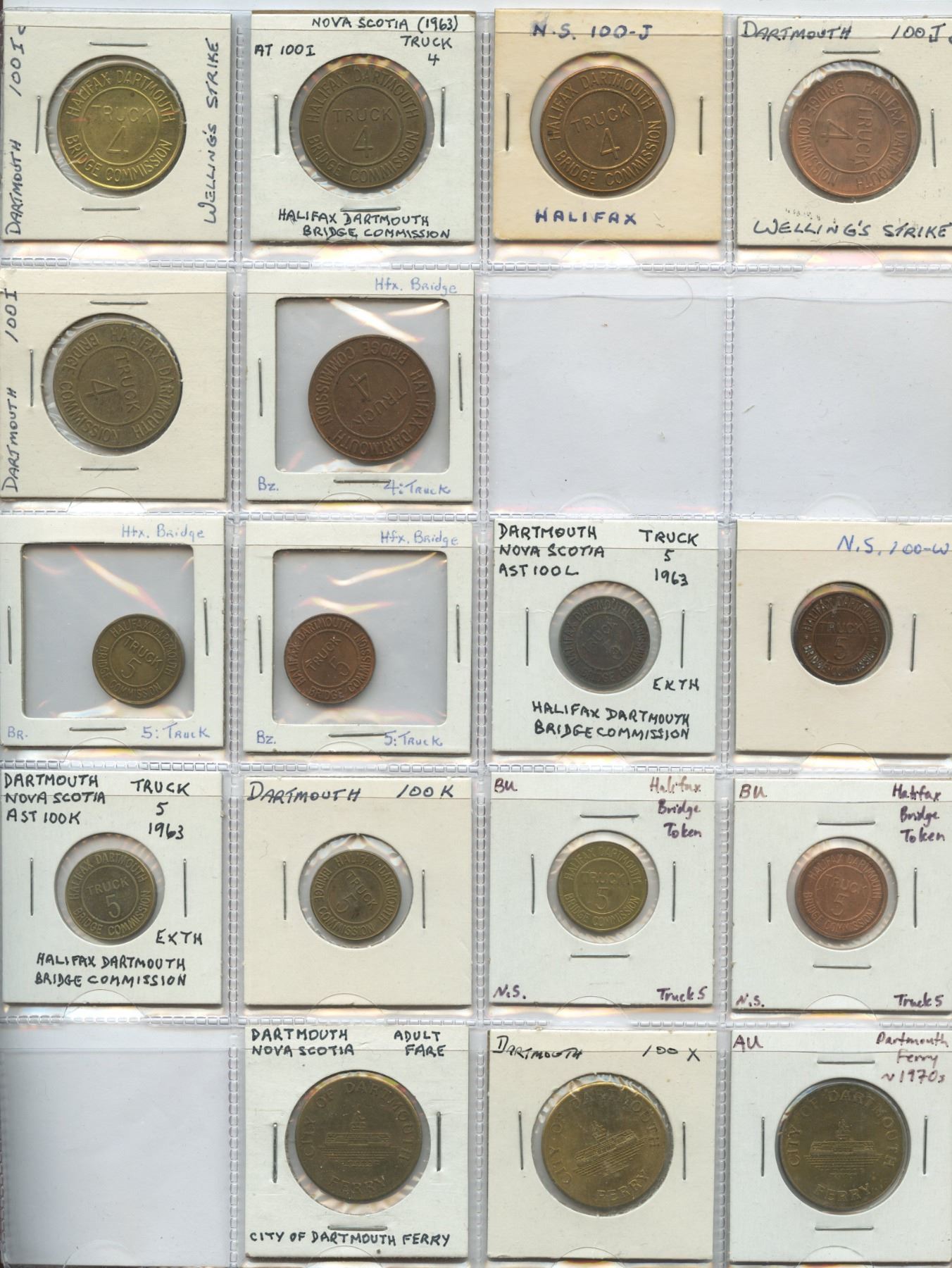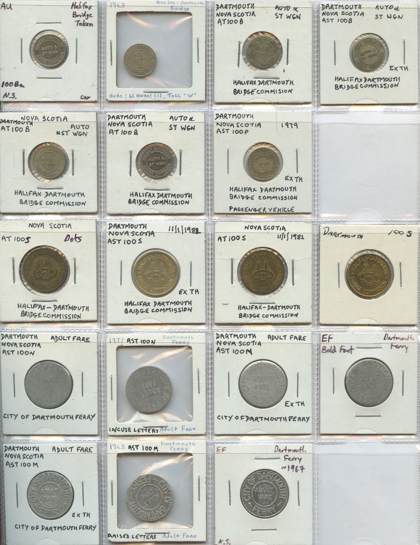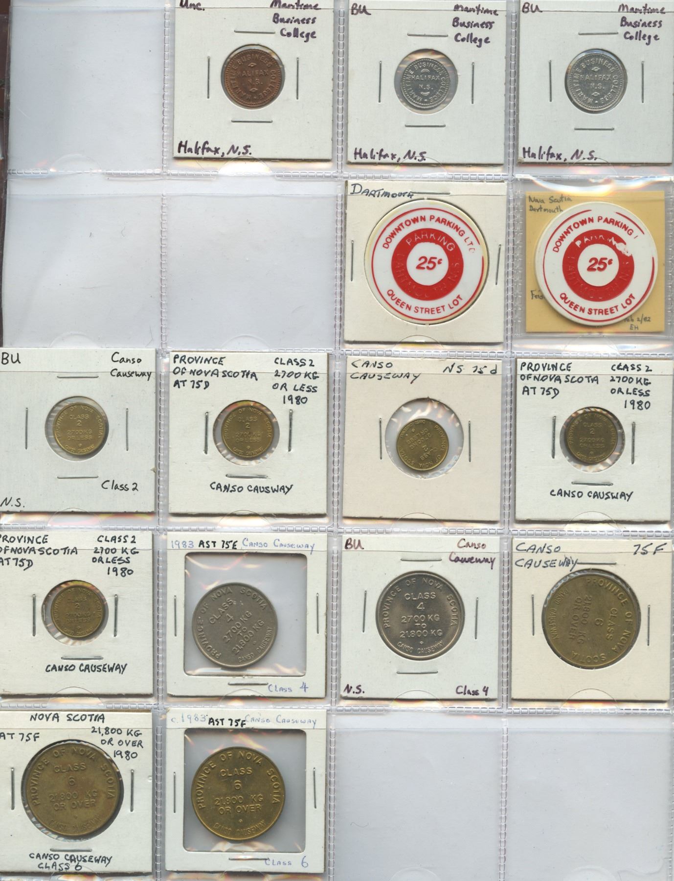 Collection of various Nova Scotia transportation tokens, including bridge tokens, causeway tokens, and parking tokens, 67 tokens in total.