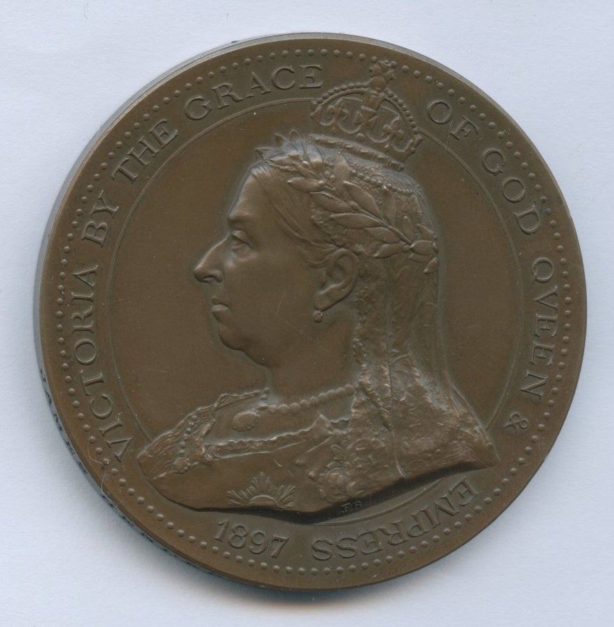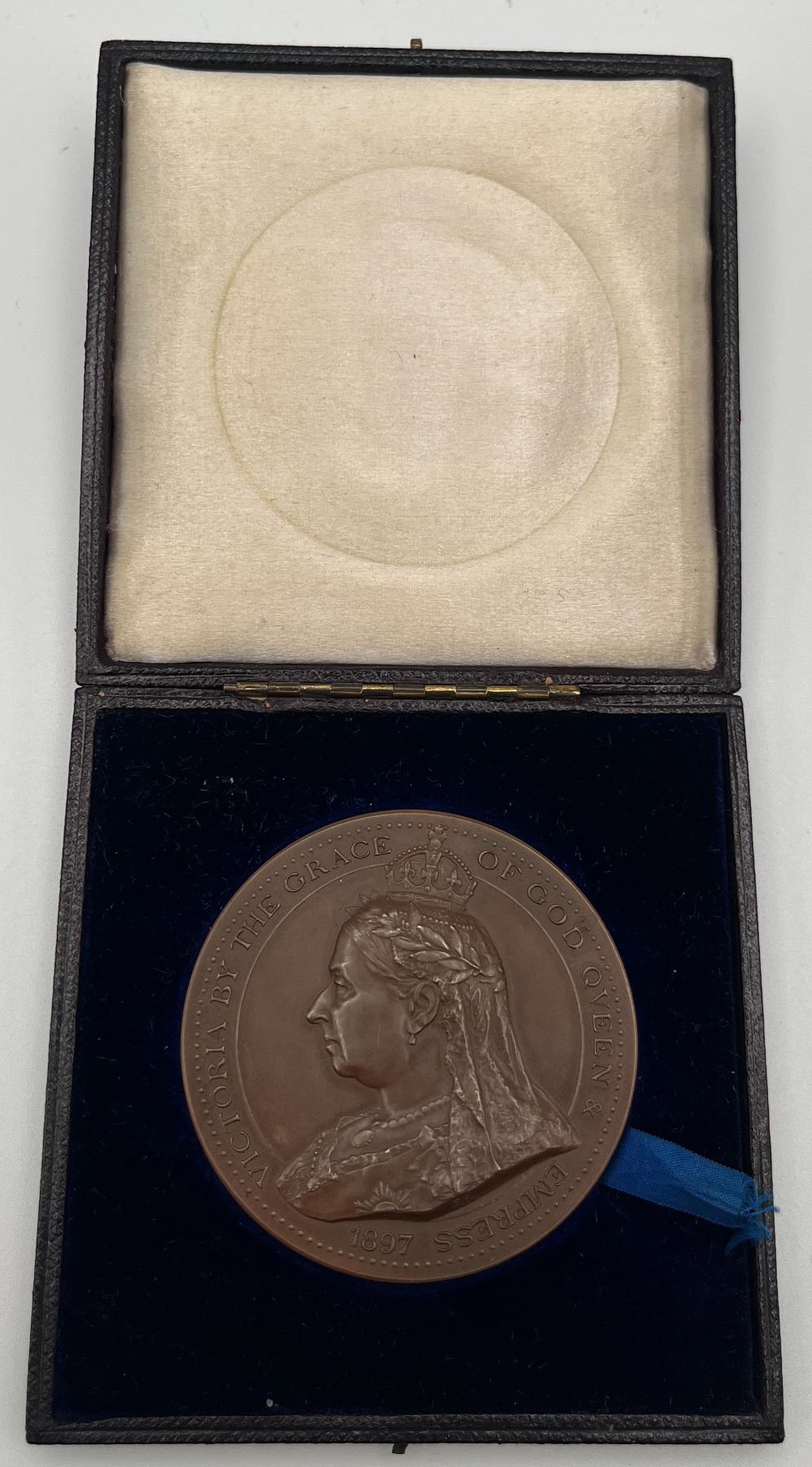 Bronze, 51mm, 66.6 gms. Eimer 1825. National competition medal of the Department of Science and Art. Obv. has the inscription Victoria by the Grace of God Queen and Empress 1897 and a crowned and laureated bust of Queen Victoria. Rev. has an inscription within a laurel wreath which reads National medal for success in art awarded by the department of science and art. In case.