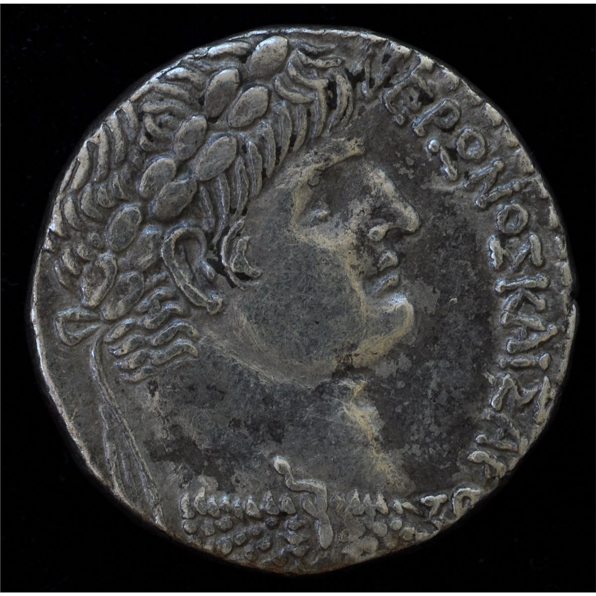 Nero (54-68 AD) - Antioch AR-Tetradrachm Syria Obv: Laur. hd. of Nero r. Rev: Eagle stg. l., palm in field l., partial date letters in right, next to wing. No legend. 15.0 grams S-617. EF.